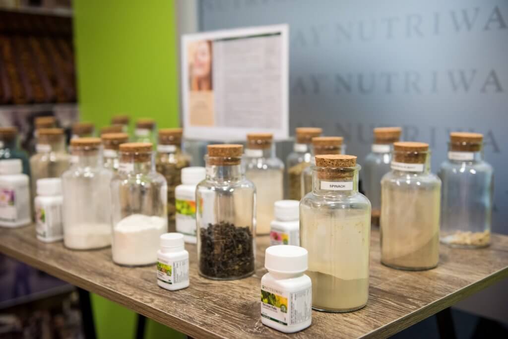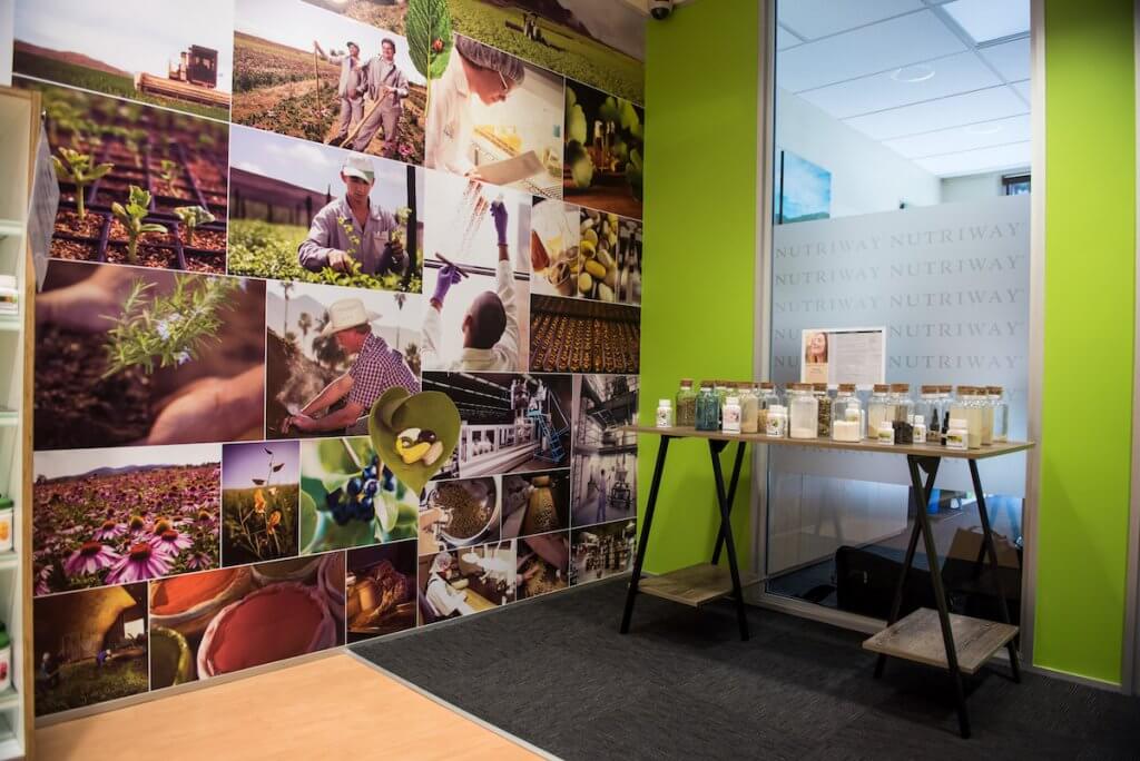 The use of lighting was carefully considered, as it not only serves a practical purpose but also elevates the shopping experience. This strategic choice complements the contemporary design ethos, contributing to a fresh and vibrant environment. A collage wall within the space serves as a focal point, celebrating the brand’s heritage, values, and product offerings. This commercial fitout design feature creates a visual narrative that engages customers from the moment they enter the space. The collage wall showcases a variety of images and graphics that highlight the different product categories and the lifestyle associated with Amway’s offerings.