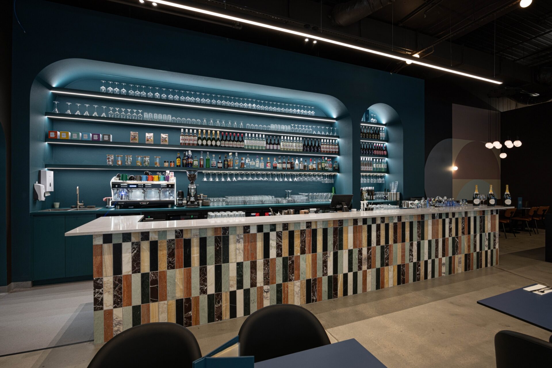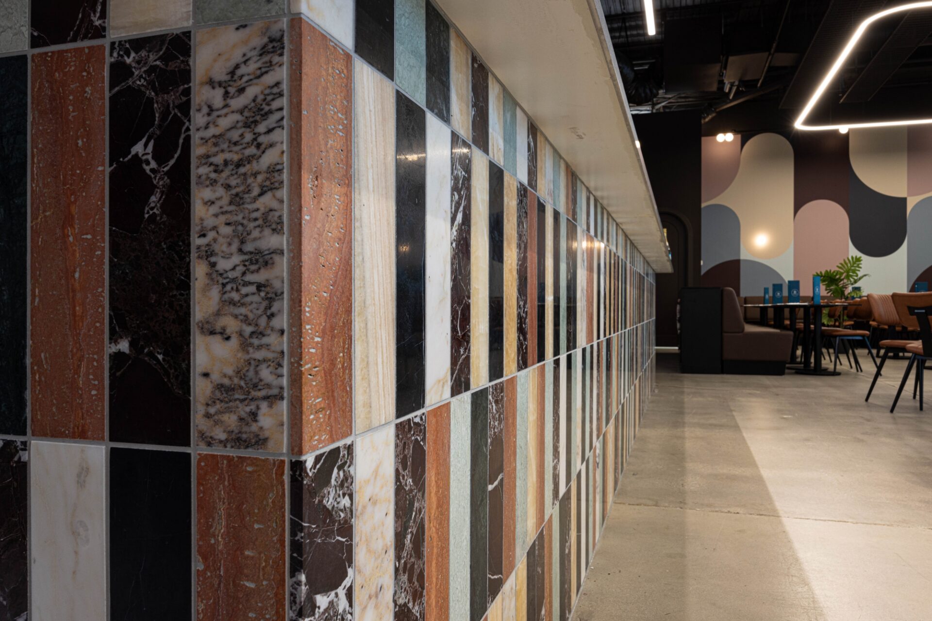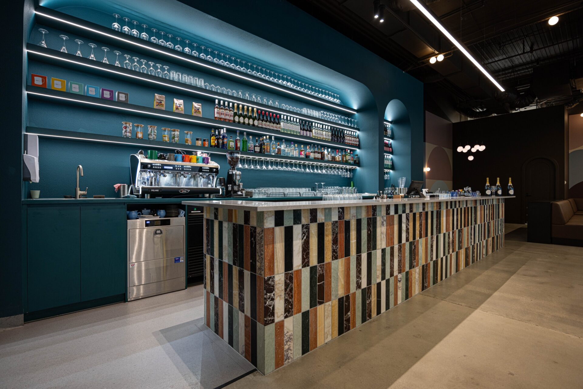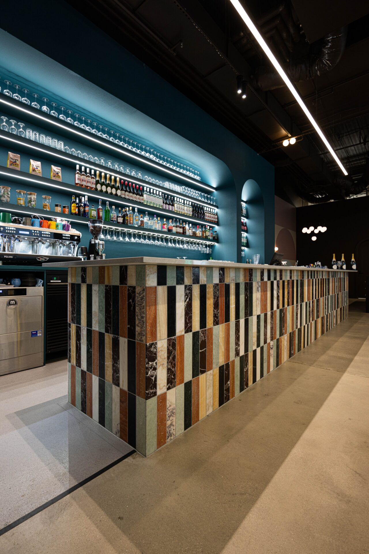 The commercial design style is warm and inviting, with a focus on texture, coloured marble, and custom joinery to create a lively yet cozy atmosphere.
