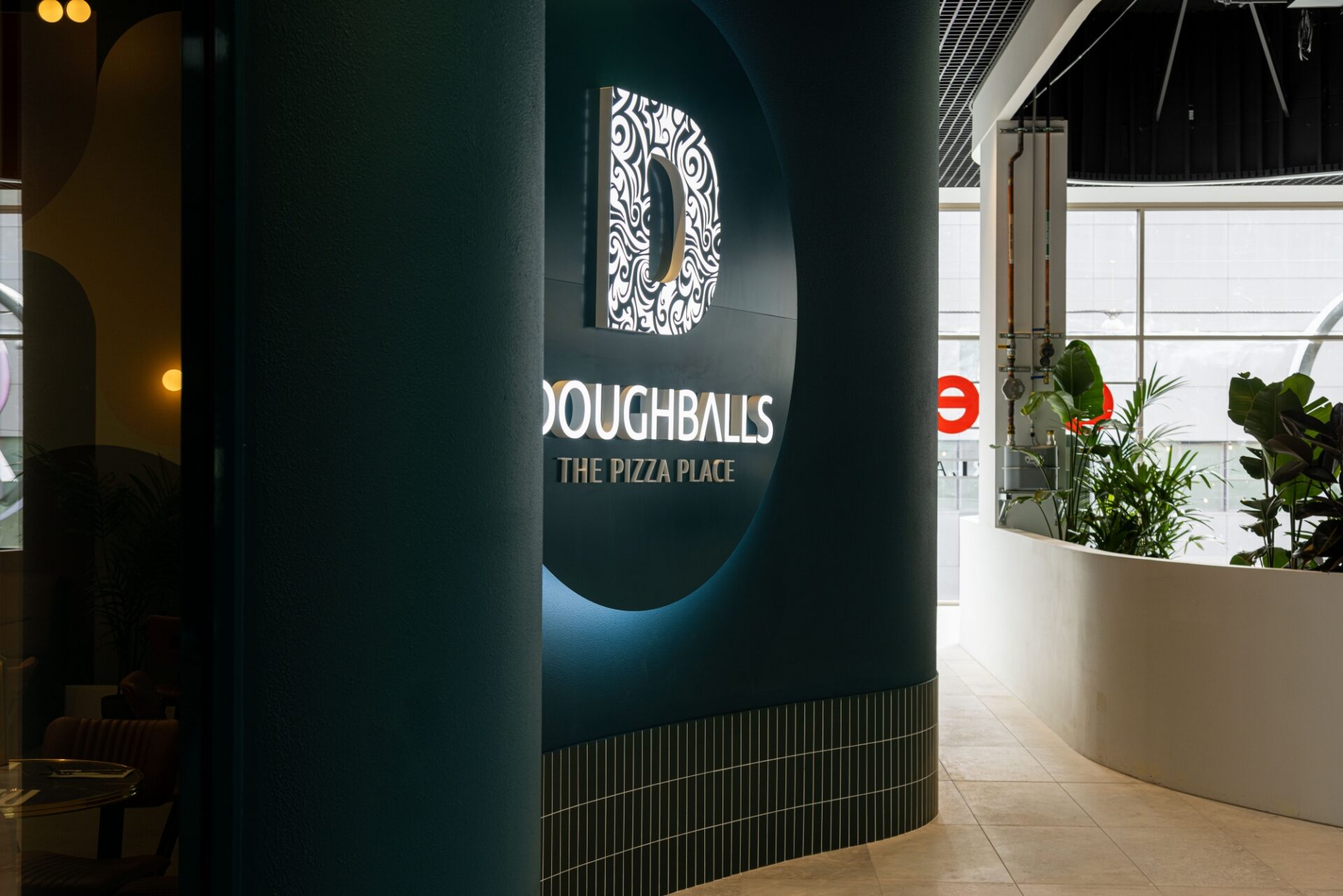 A key feature in the commercial hospitality fitout is the integration of brand identity through statement wall art and decorative accents, which reflect the dough ball theme and local culture. The eye-catching counter design ensures functionality, while pendant lighting over the tables creates intimate dining spaces. Natural light, combined with the warm, earthy tones and sleek finishes, contributes to a bright and airy atmosphere, making the space both visually appealing and comfortable for diners.