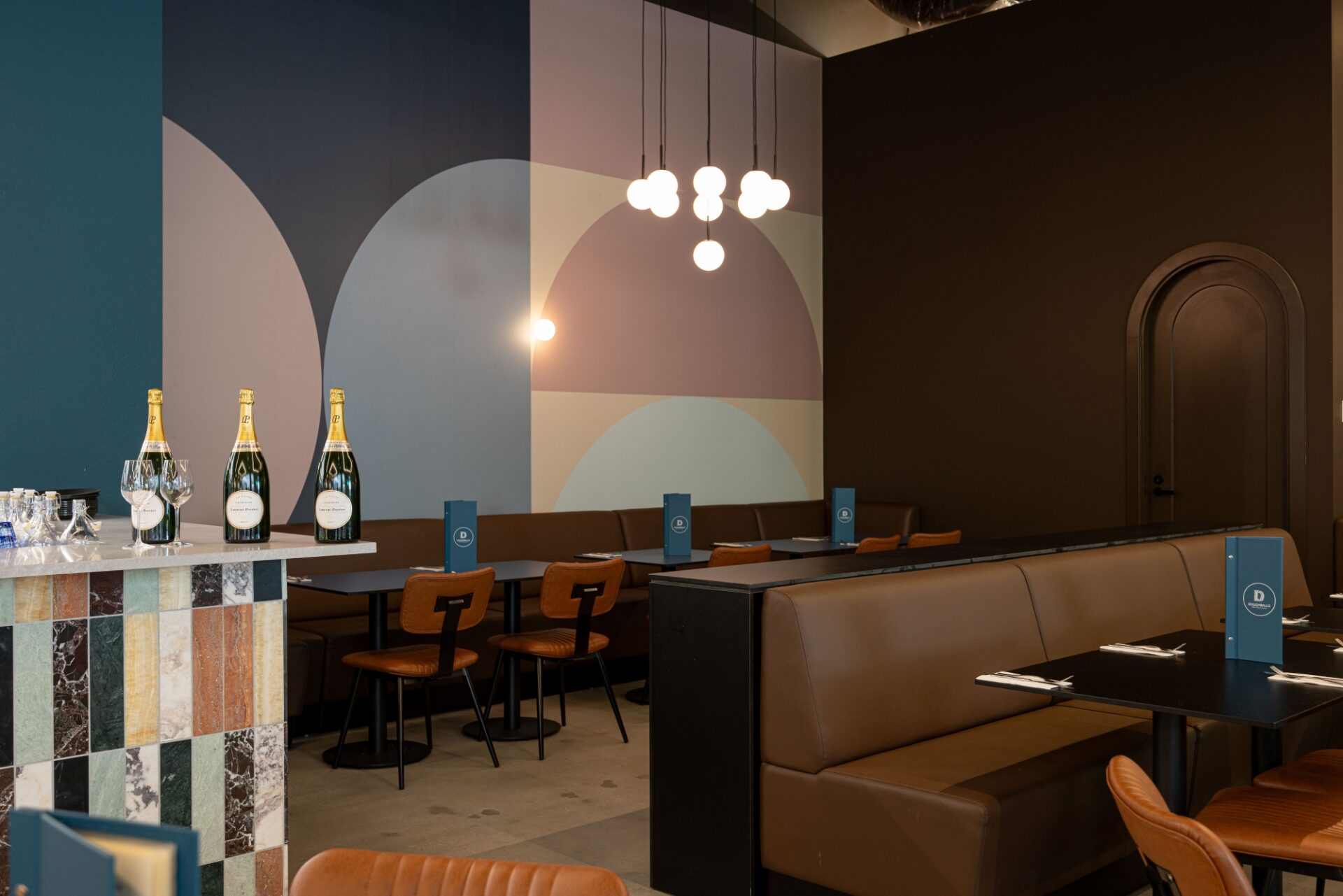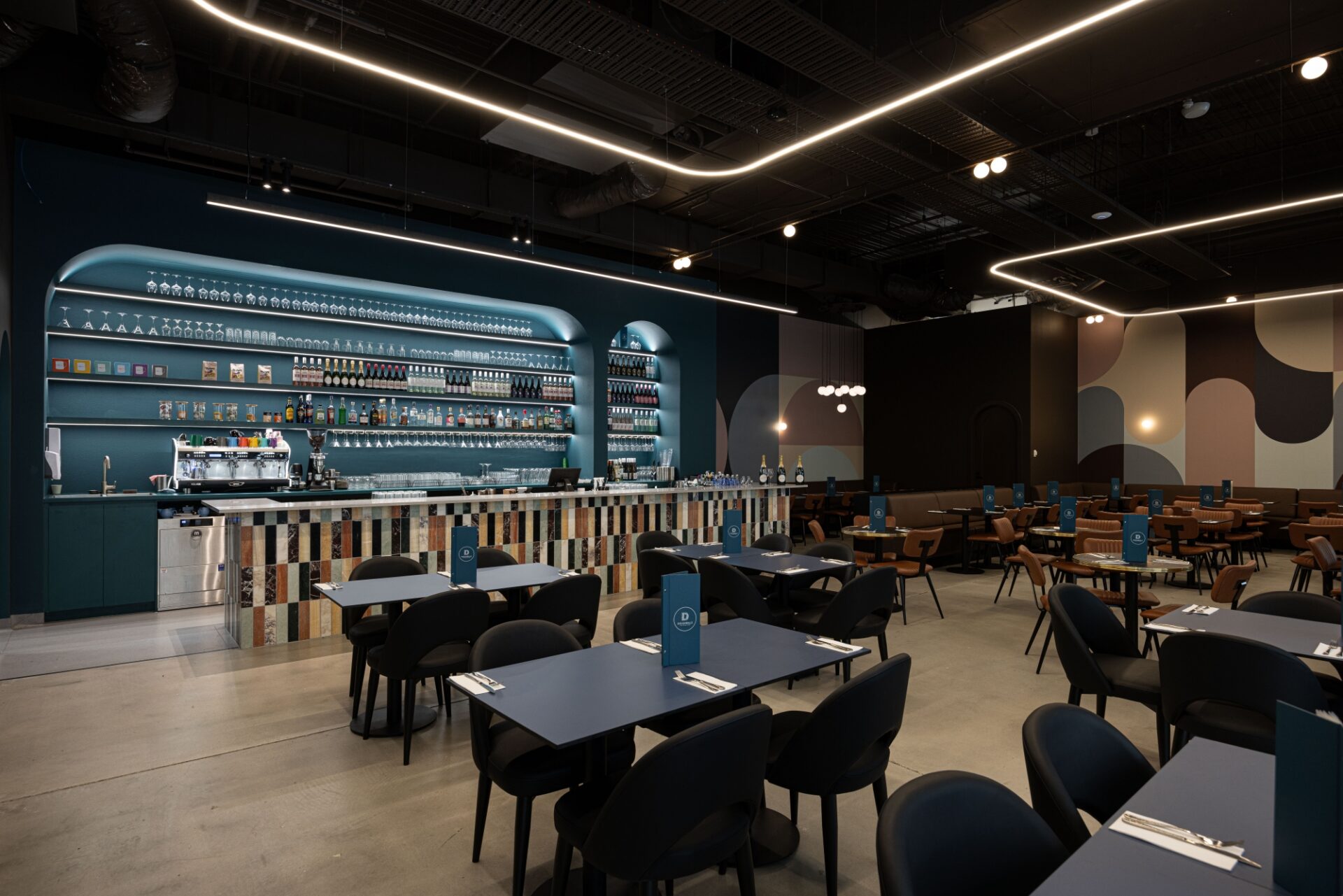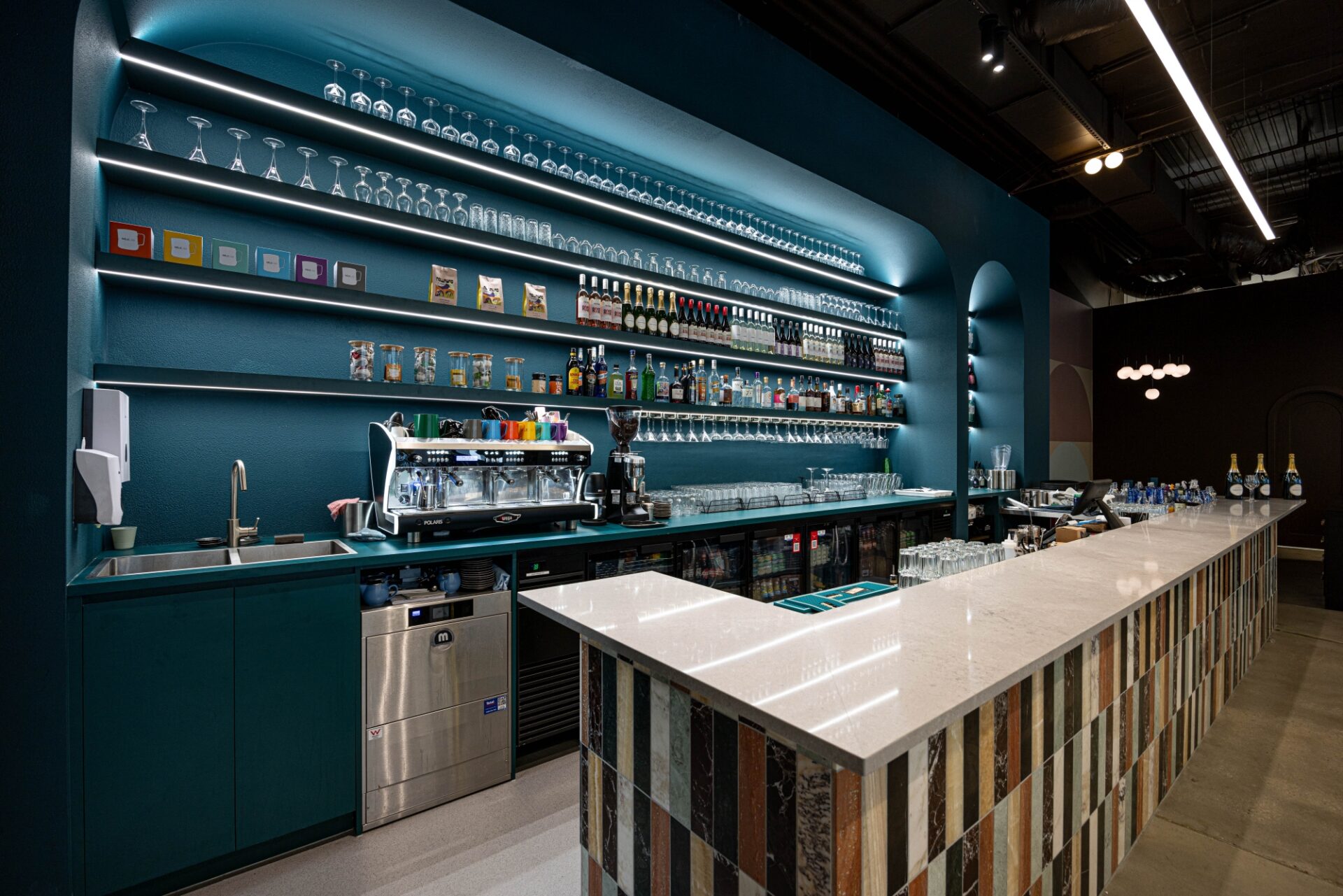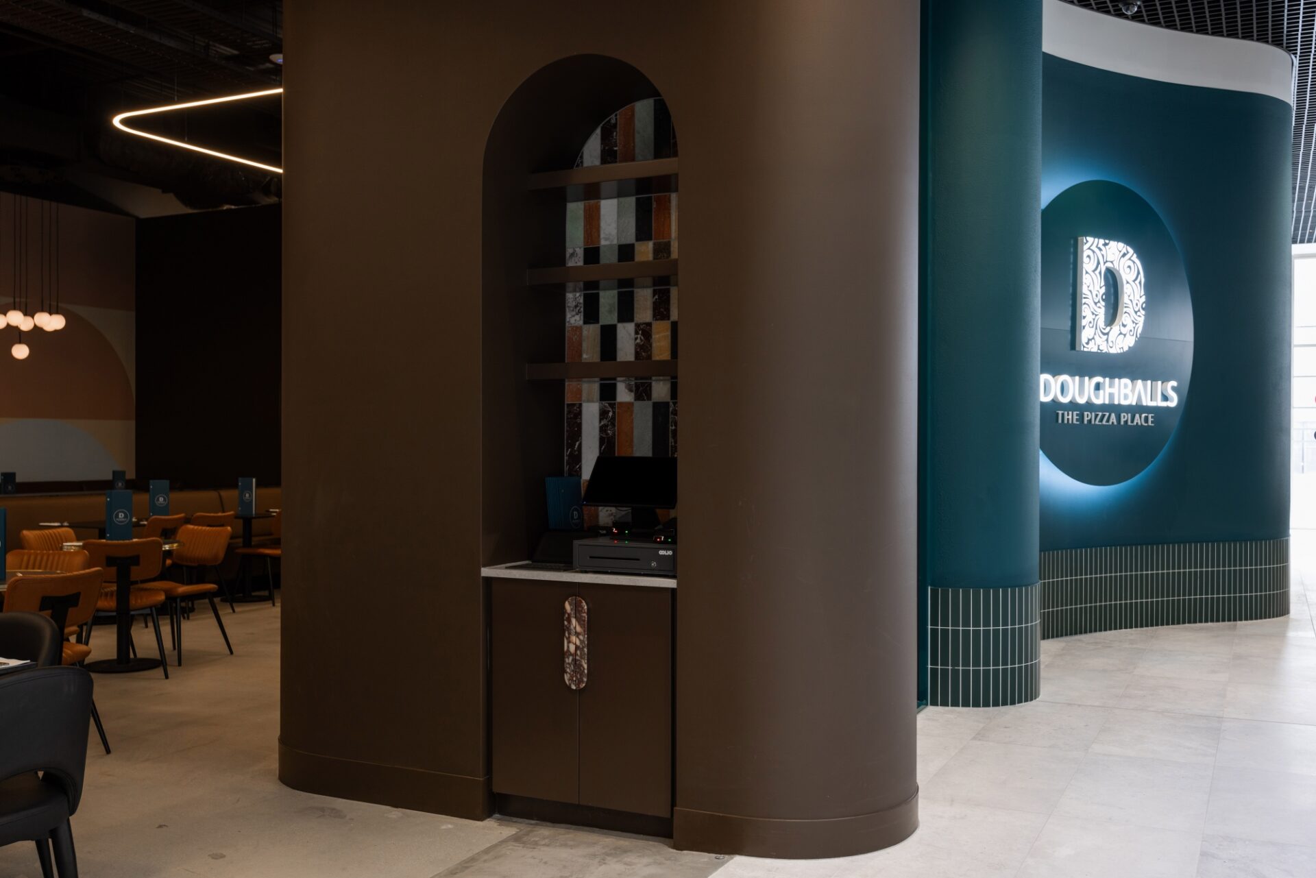Read more: DoughballsThe commercial fitout embraces a playful colour palette, dominated by a gorgeous deep blue, offset by soft beiges, browns and subtle pops of colour through artwork or accent pieces. The use of textured walls and soft furnishings, such as upholstered seating, adds depth and comfort, providing a tactile contrast to the harder surfaces like wood and tiling.