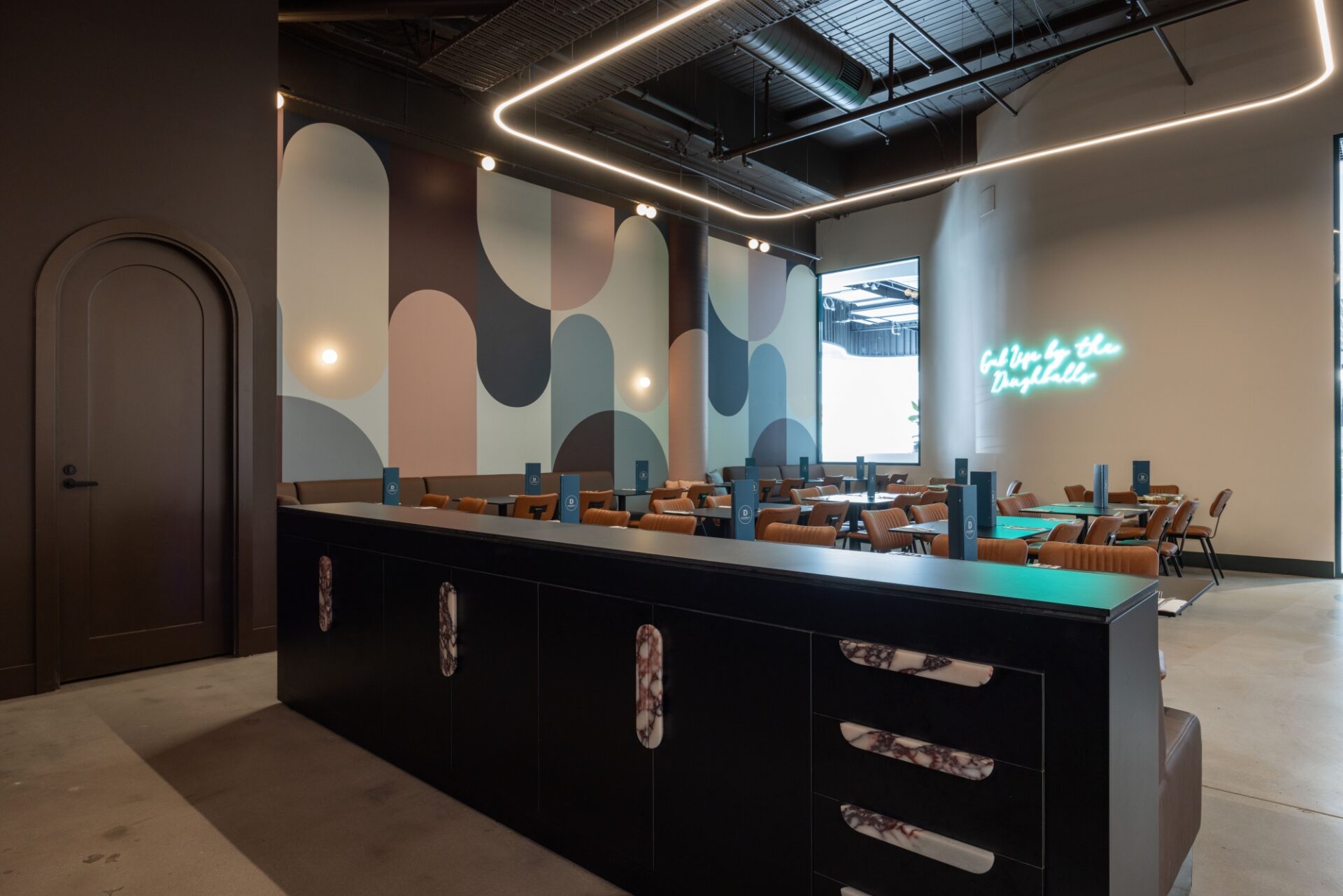Doughballs commercial restaurant and bar fitout by Total Fitouts Adelaide Central, commercially designed by Muse Design is located in the bustling Rundle Mall, the central hub of Adelaide’s city life. Specialising in pizza and cocktails, Doughballs commercial hospitality fitout provides a moody, ambient dining experience that reflects its playful, energetic neighbours at Funlab.