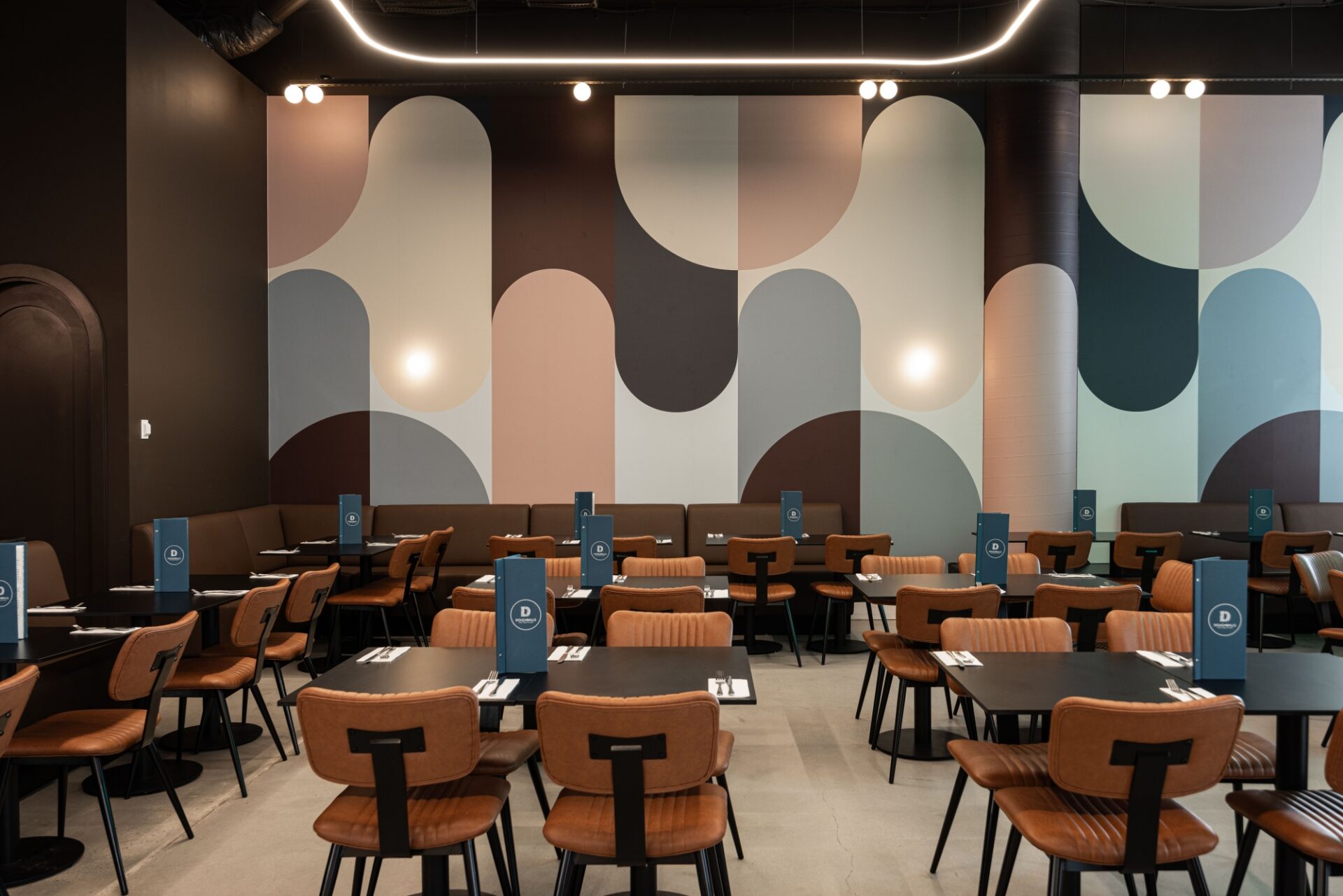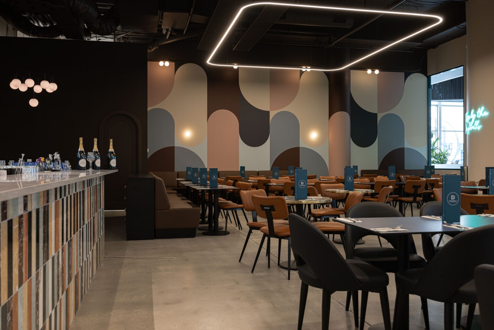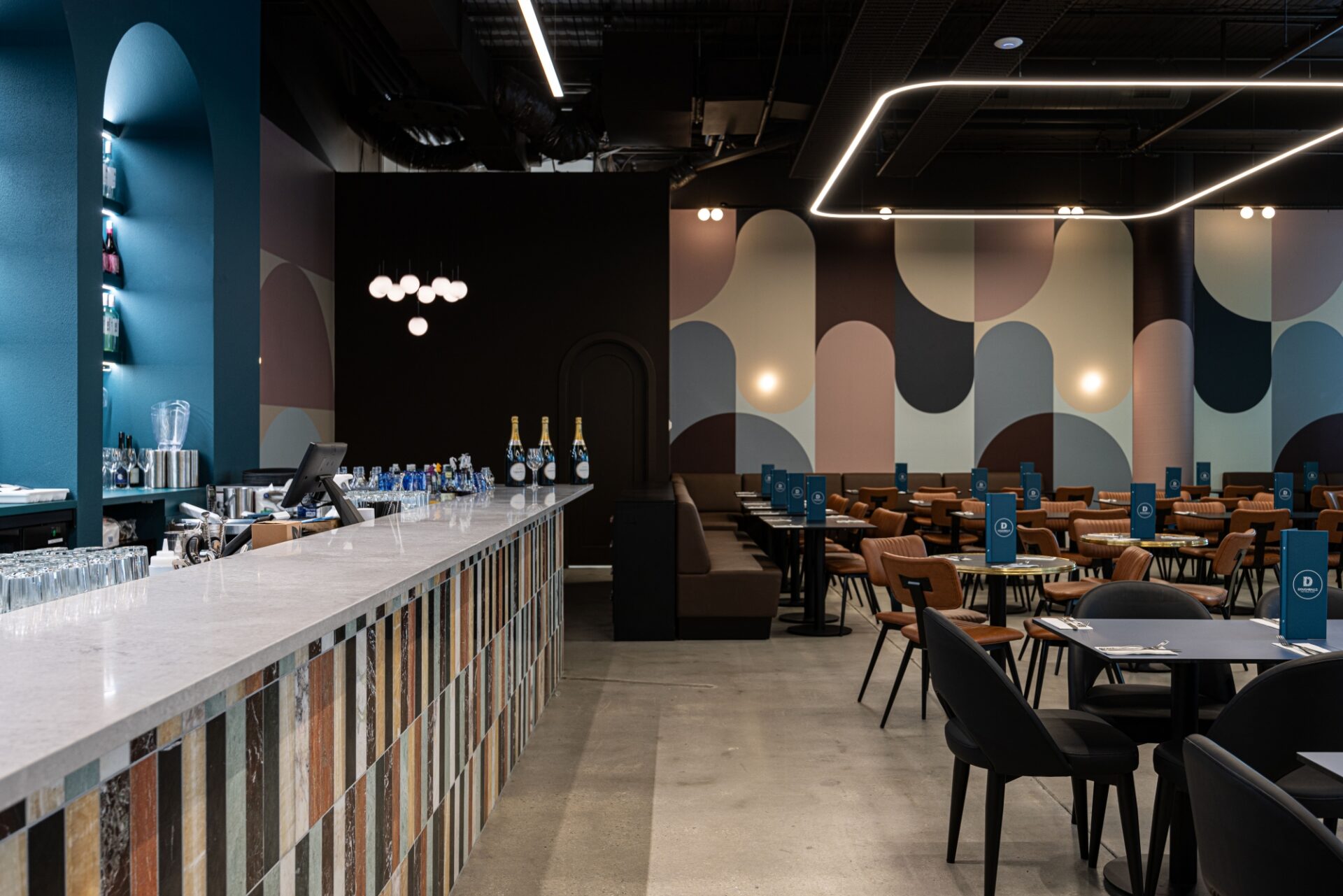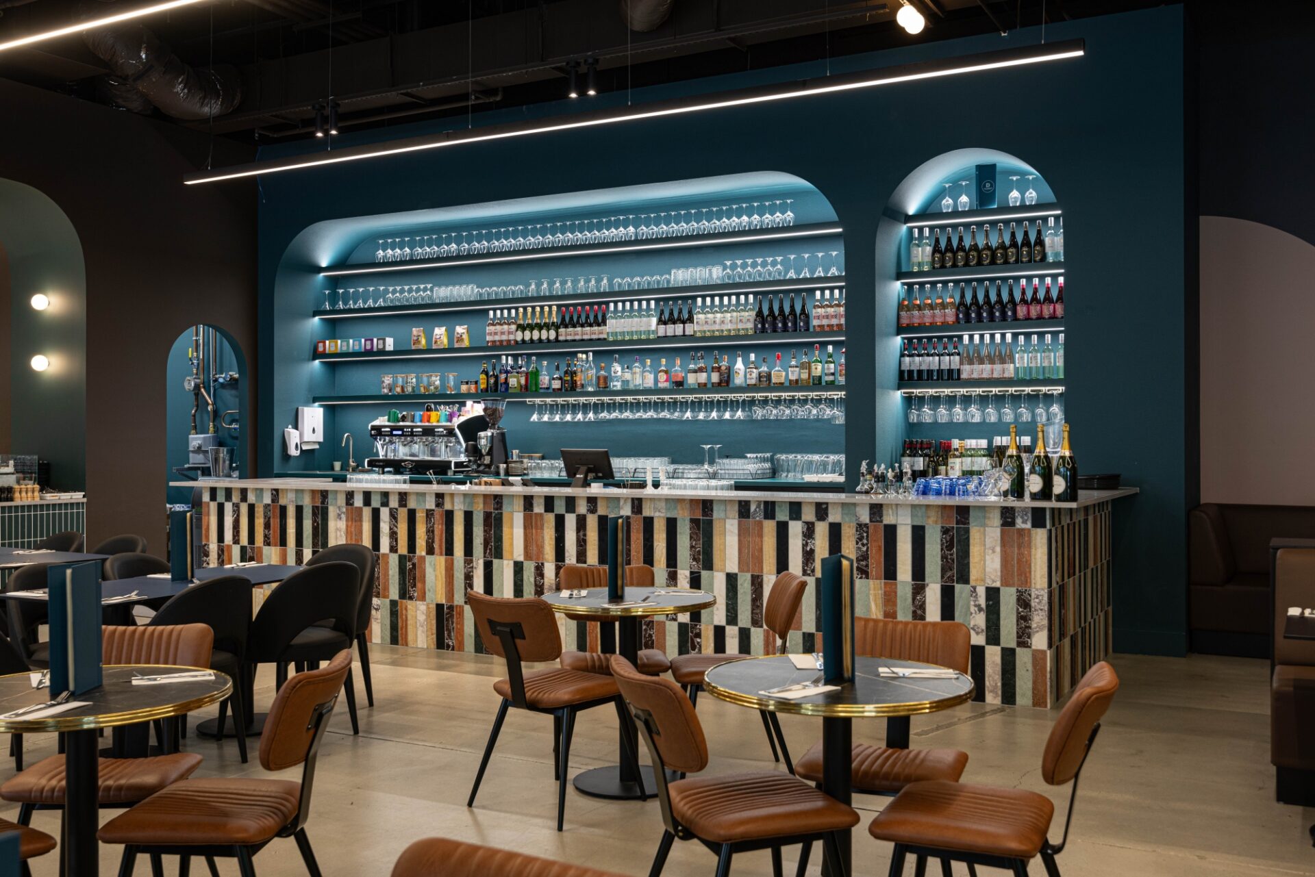 Amethyst Hudson, Commercial Designer at Muse Design said, “The use of curves throughout the space, particularly framing the kitchen and back bar, complements the circular strip lighting, adding a distinctive flair that sets the venue apart from other restaurants in the area. The coloured natural stone tiles on the bar create a beautiful focal point, balancing luxury with the budget constraints.”