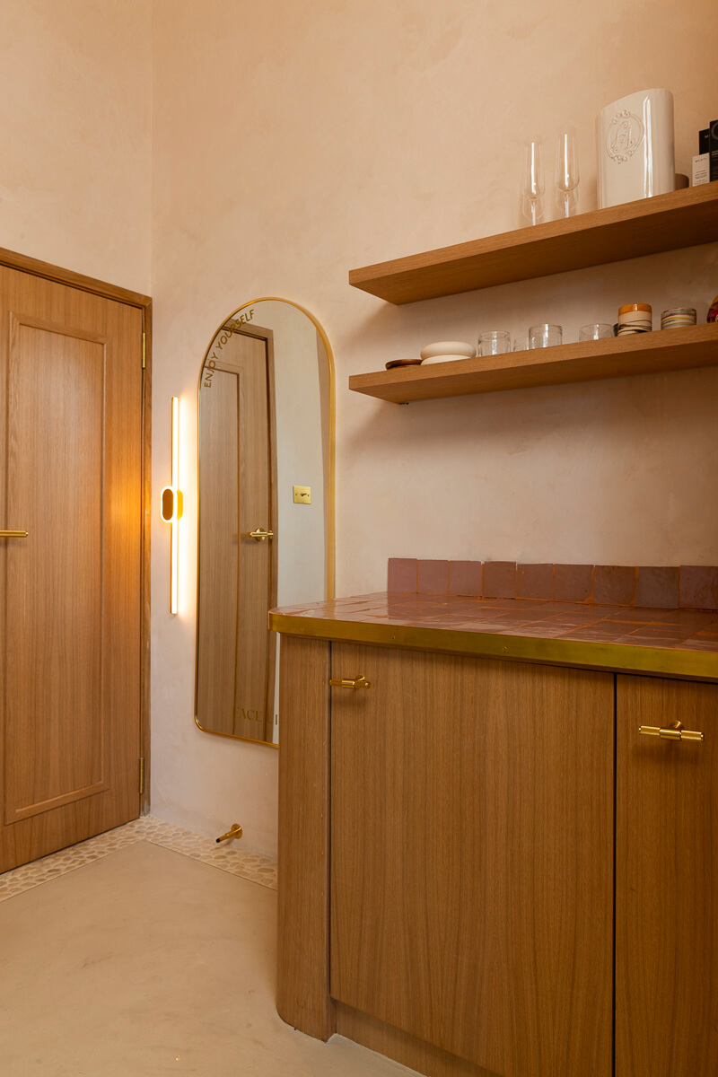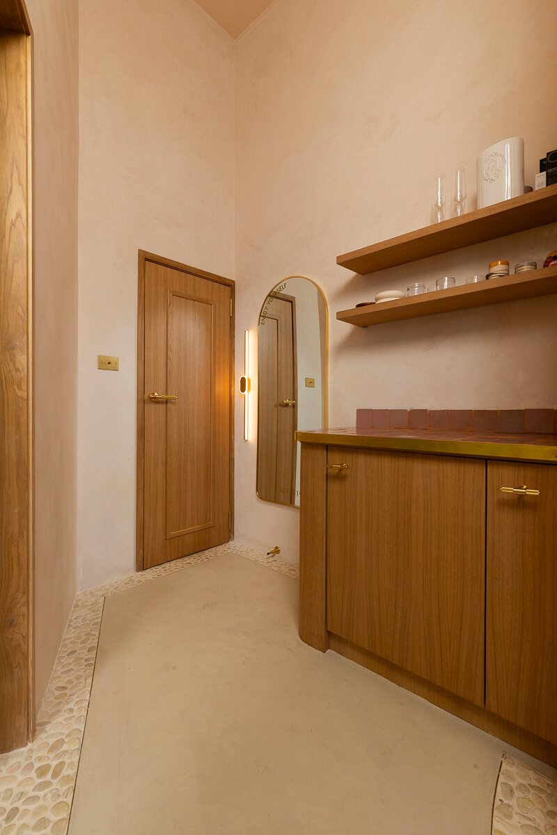 The Face Up commercial wellness and beauty fitout project showcased meticulous attention to materials and finishes. Oak veneer cabinetry, solid oak skirting, and door frames, complemented by brass detailing, exuded a stylish and sophisticated ambience. French wash finished walls, completed by MJ Revival, stone pebble tiling in the bathroom, and a unique mosaic pebble stone tile parameter added distinctive touches to the space. Absolute Resurfacing, a supplier who handled the micro topping for the flooring says, “The system used to achieve the desired finish was Permacolour Microtopping system with commercial grade water based acrylic sealer x 3 coats plus x 2 coats of matt polish.” Voltzy Electrical, who managed the intricate lighting installations says, “Face Up beauty was our most detailed project to work on in 2023. From the illumination of the curved walls and shelving coves to the buster and punch switchgear there was no detail spared in the realm of high end commercial fitouts. Our team and the customer are very happy with the result of this project and it couldn’t have been managed better without Luther and his team at Total Fitouts.”