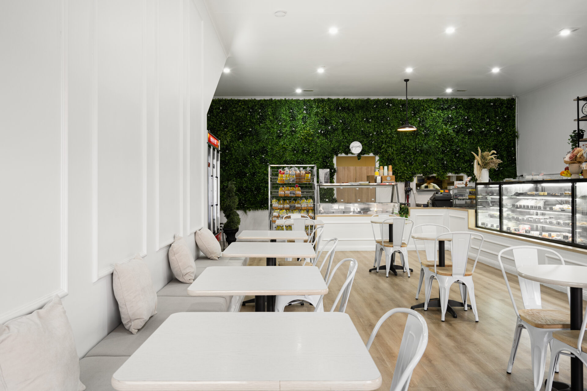 Bespoke workbenches were hand-installed, and ample seating was fitted across the space, ensuring that customers had plenty of space to relax and enjoy their baked goods and quality coffee. The front of house featured display cabinets, built-in benches, upholstered seating, and bespoke signage.
