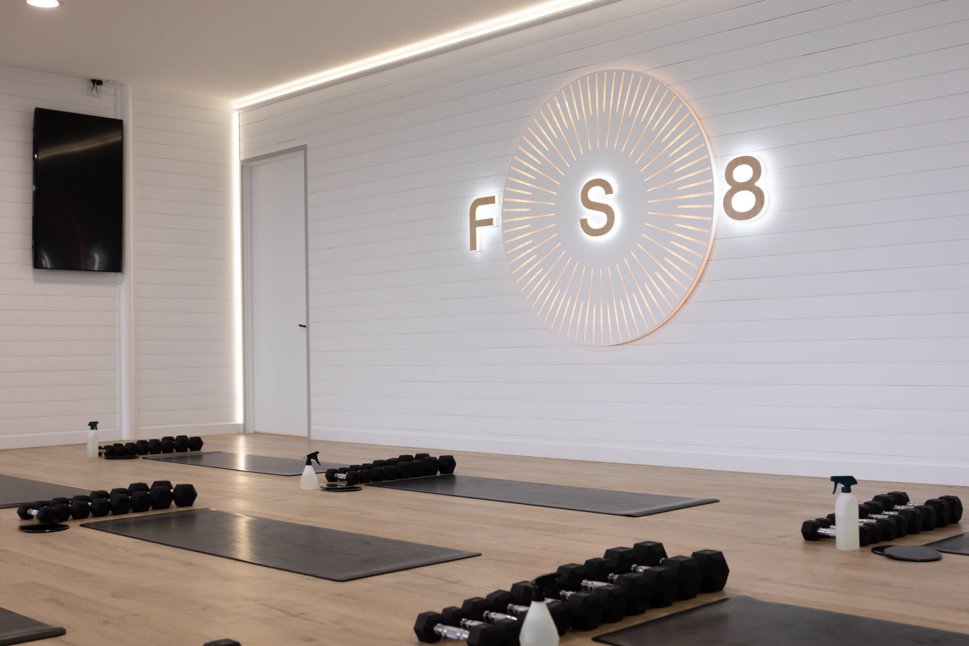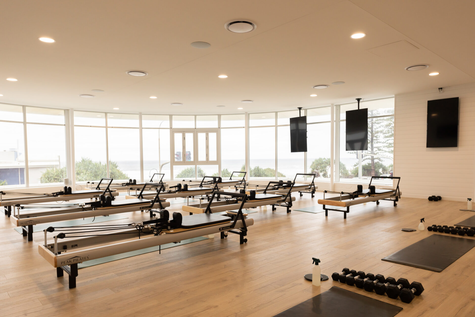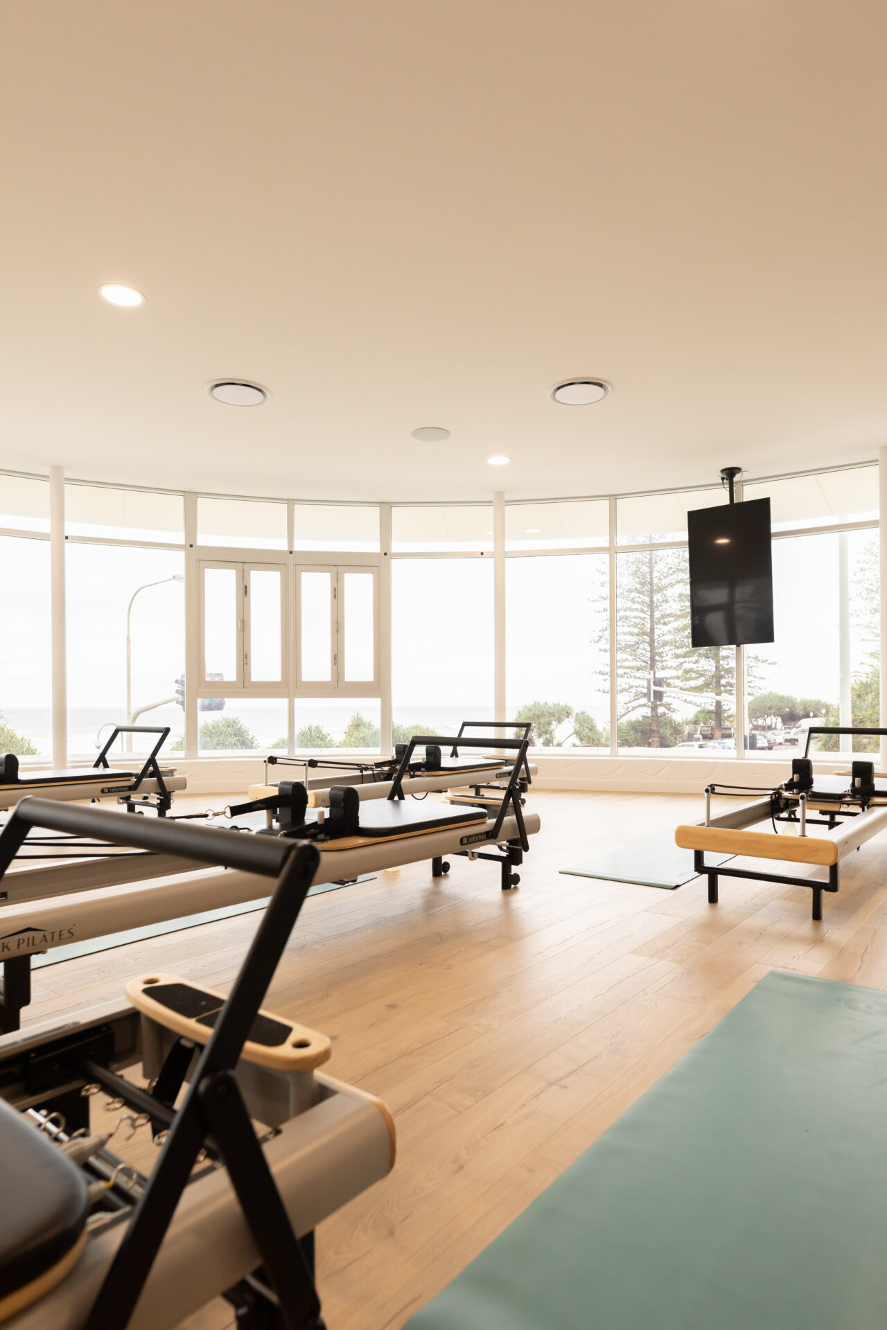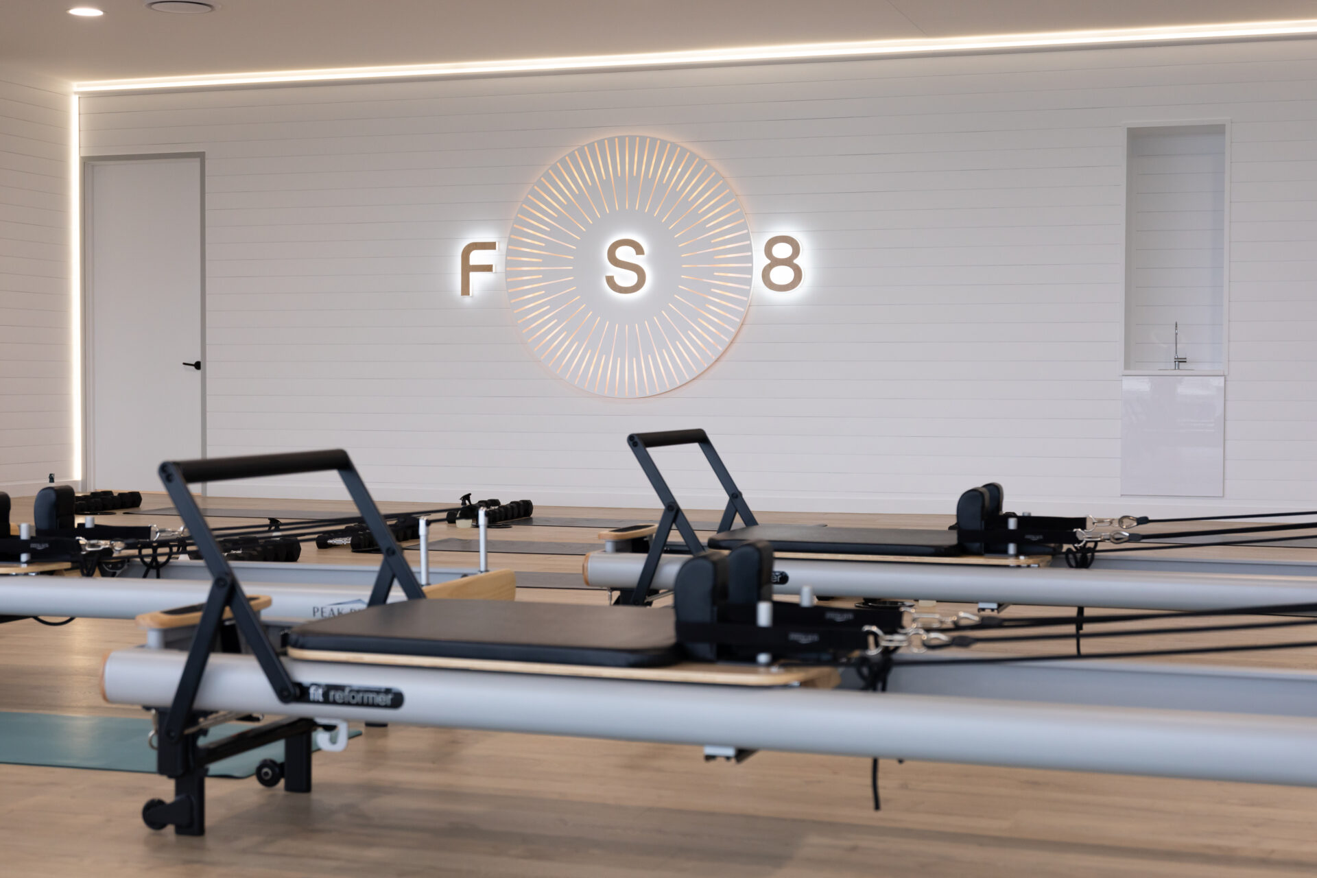 The clients wanted a serene, calming space with a natural, beachy vibe. The building was transformed into a modern, fresh fitness space featuring wooden floors, bespoke wooden panelling, and lighting. Multiple wooden Pilates reformer machines were installed alongside AV equipment and individual screens to enhance client training and program interaction. Branded signage was installed with beautiful LEDs and strip lighting to enhance the visual impact.