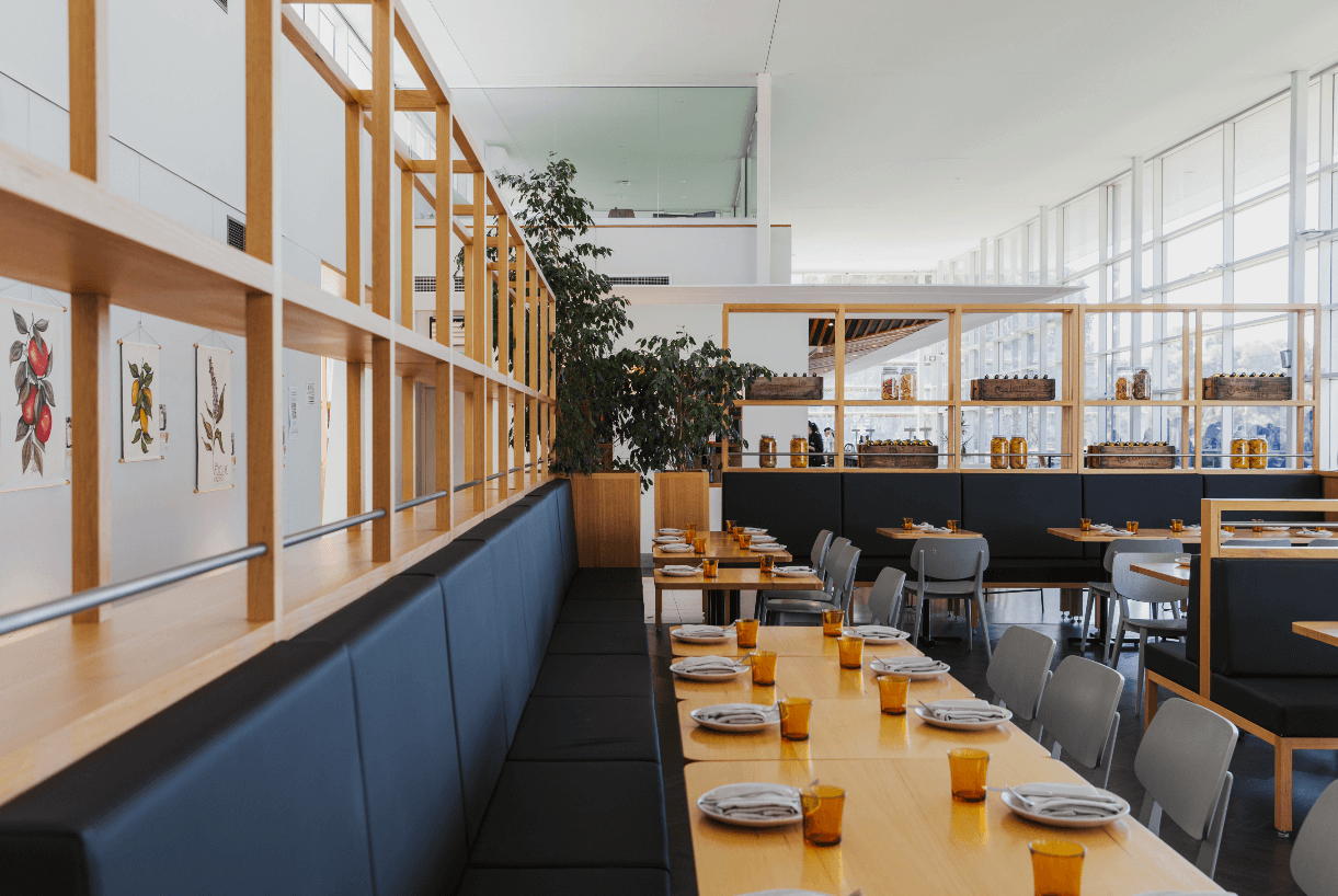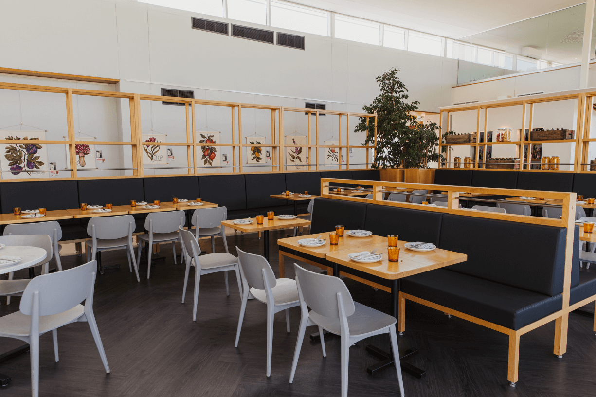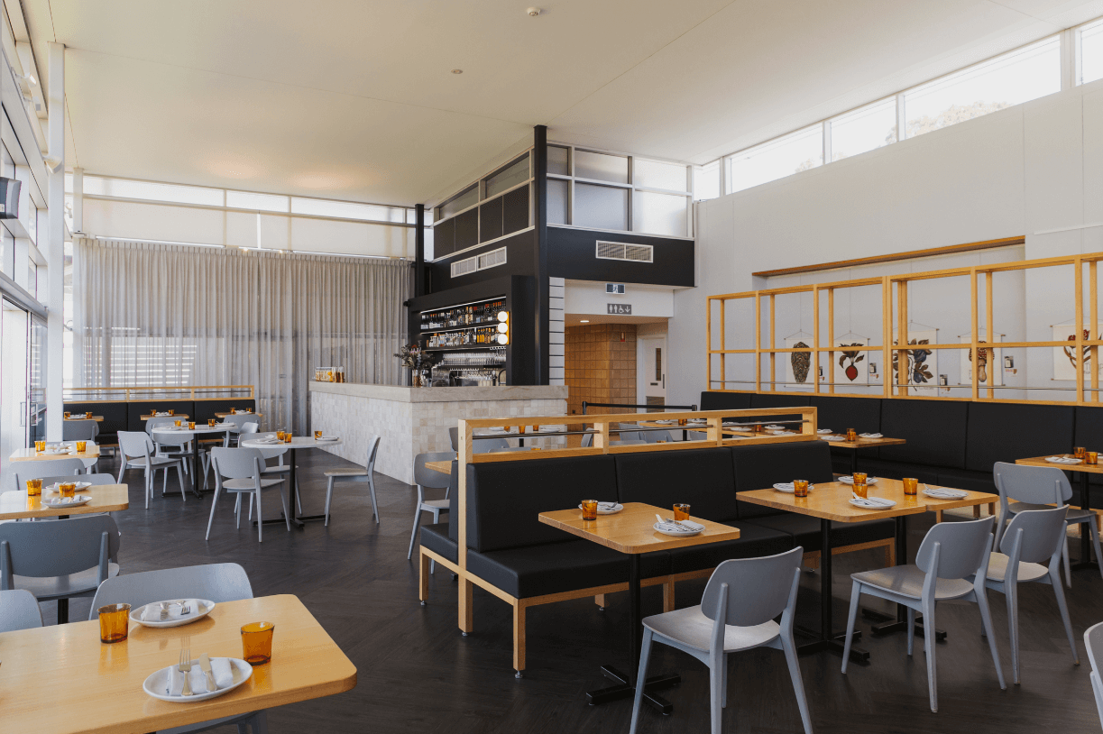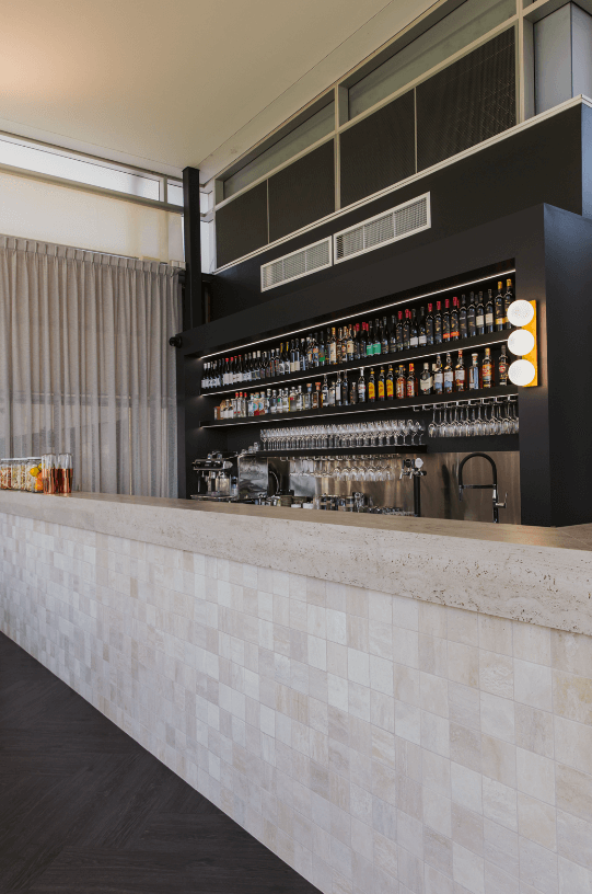 A distinguishing feature of the commercial design is the bold incorporation of robust black steel elements, artfully contrasting with the light timbers. This deliberate choice introduces an industrial edge to the design while preserving an air of sophistication, resulting in an inviting and harmonious space that appeals to a wide range of visitors. The open dining space with a luxurious counter area helps section off the build and create multiple multi-functional spaces. Dark timber herringbone flooring is featured along with beautiful square stone tiling along the counter to create cohesion with the neutral colours of the walls and make the other timber features pop. Sheer curtains are used in the space as well to make it feel more open and light.