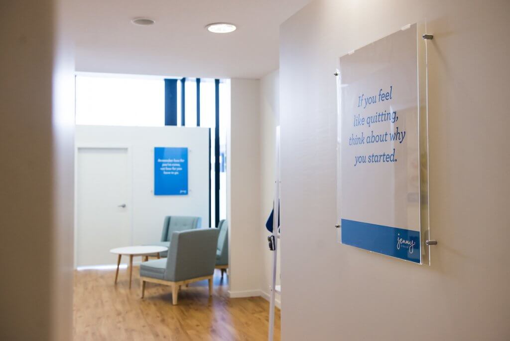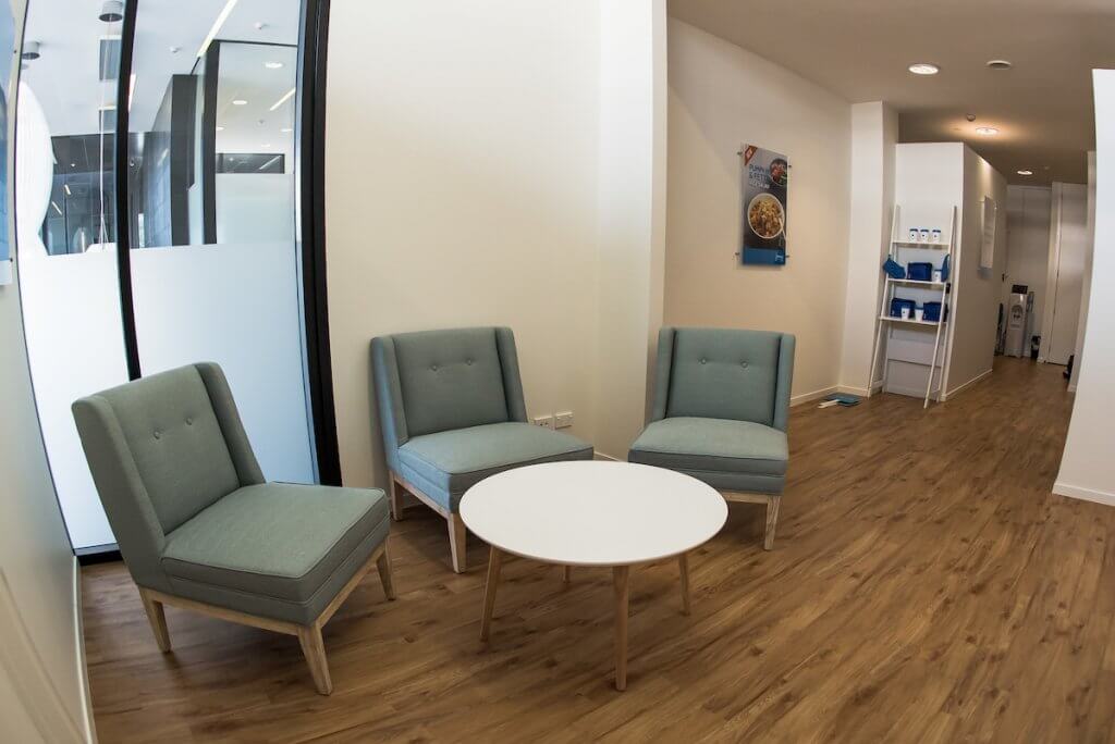 Read more: Jenny Craig TakapunaThe fitout design vision for the Takapuna office fitout was both functional and inviting. The decision to incorporate blue walls and wood floors, accented by white trim, was strategically chosen to create a calming yet professional atmosphere. The blue hues reflect tranquility and reliability—qualities that resonate with Jenny Craig’s commitment to supporting individuals on their weight management journey. The wood floors not only add warmth but also provide a durable and easy-to-maintain surface that can withstand the daily hustle and bustle of a busy office environment.