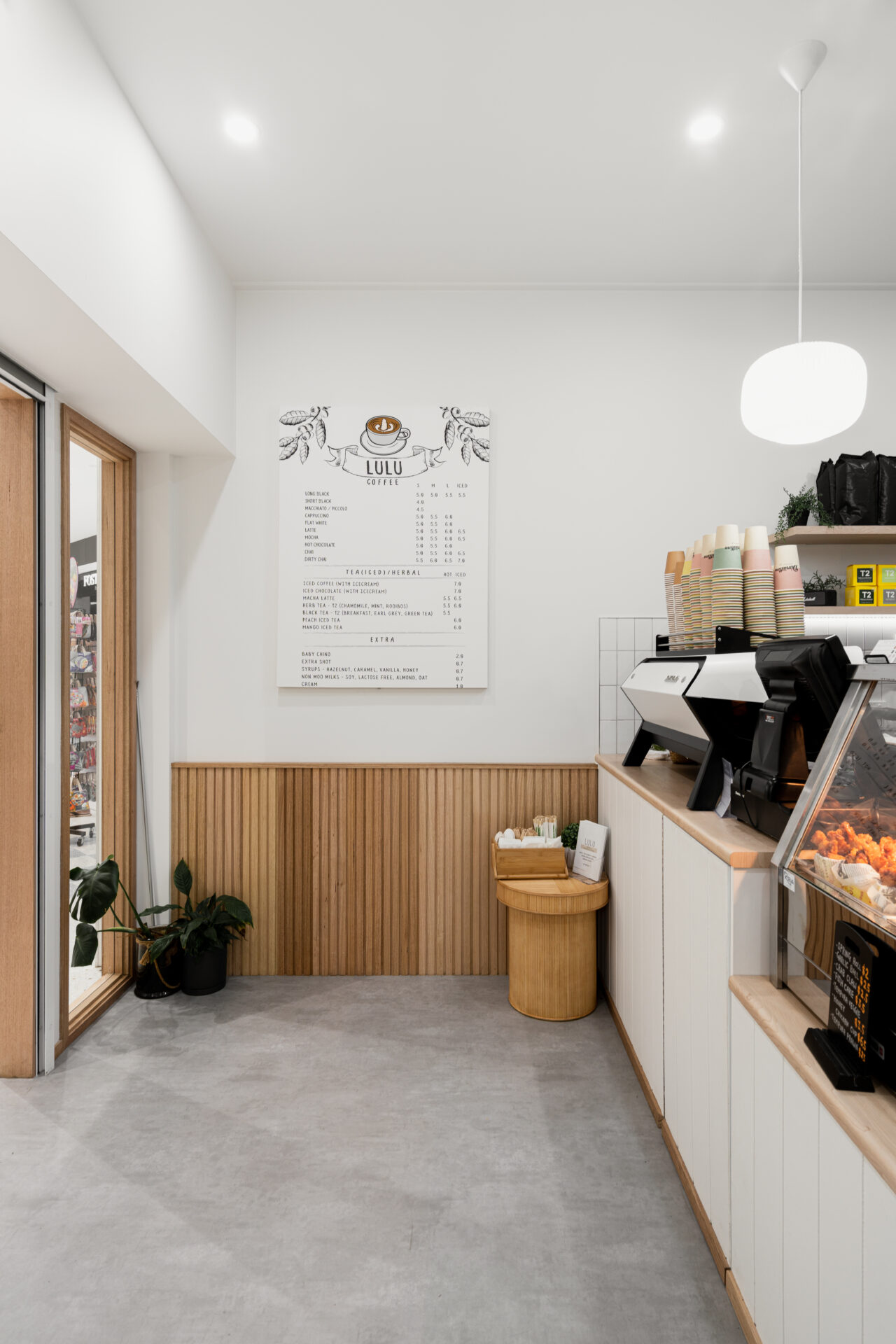 Annet says, “Lulu’s sits in the corner of Urangan shopping centre and our designers used the side walls to create a small seating area for customers to take a break and indulge in some treats. We created mood and a calming atmosphere by incorporating a neutral colour palette, on-trend white cladding, wood carpentry and plants.”