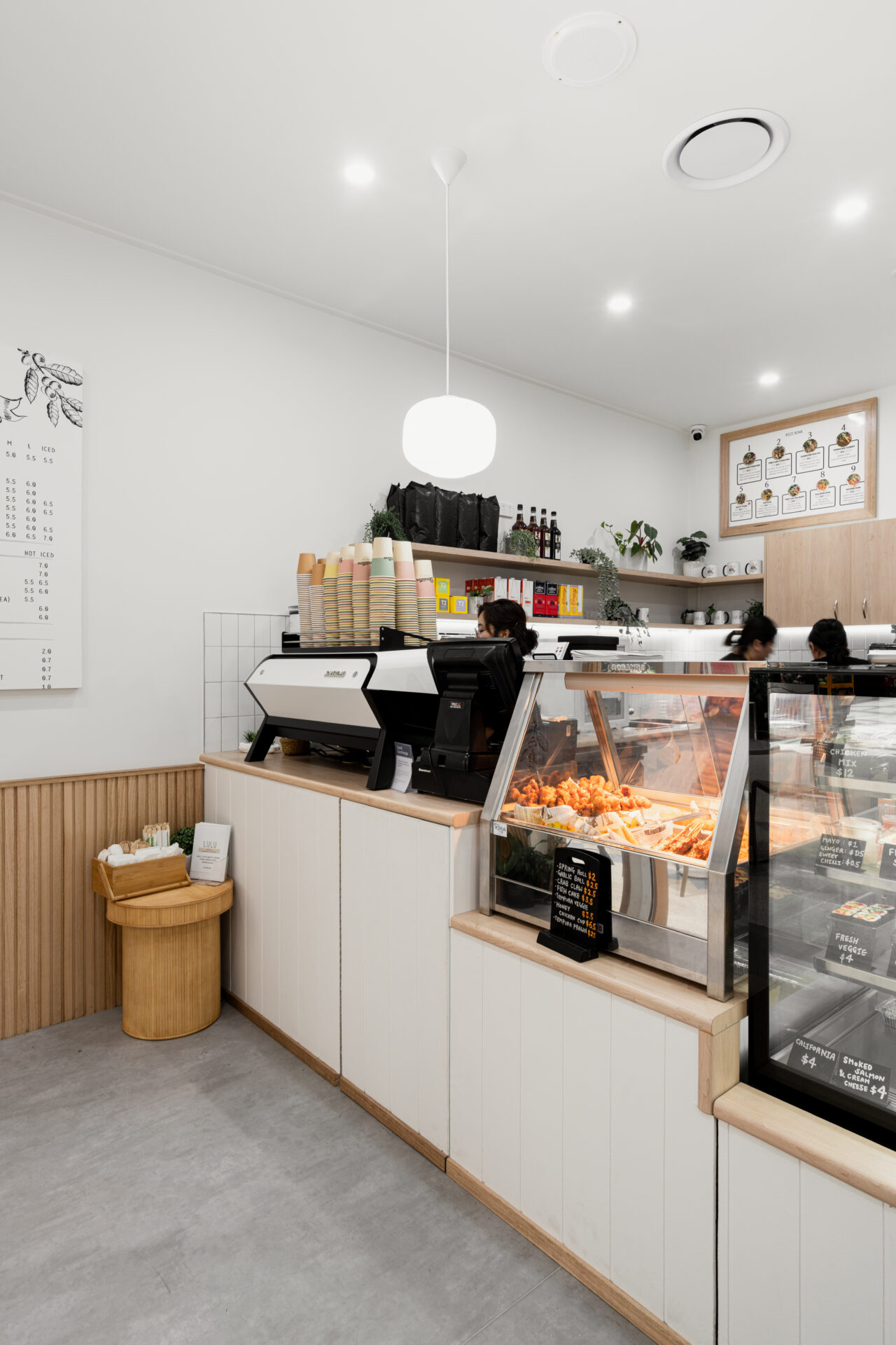 Project Manager Annet Maurer said, “The owners wanted us to design and build a modern Japandi-style (Scandinavian with a touch of Japan) eatery experience within a traditional shopping centre setting. The deceptively large project included fitting out a fully functioning commercial kitchen, with refrigeration, storage, and workspaces, plus creating a fresh and modern bespoke front of house servery area with hand crafted wooden baton features and a linear cladded counter with solid wooden benchtop.”