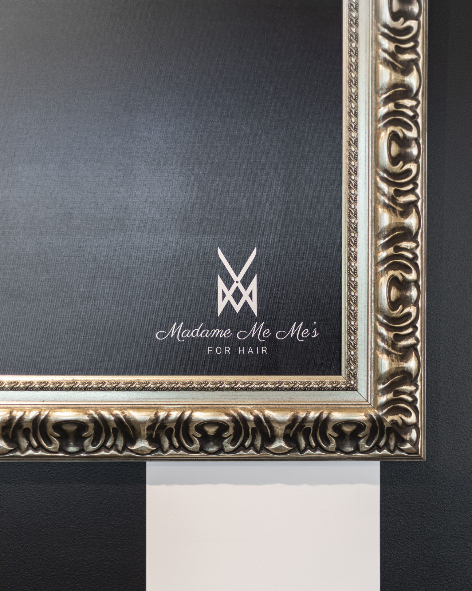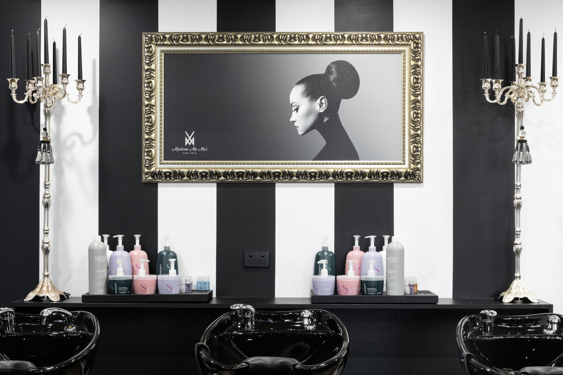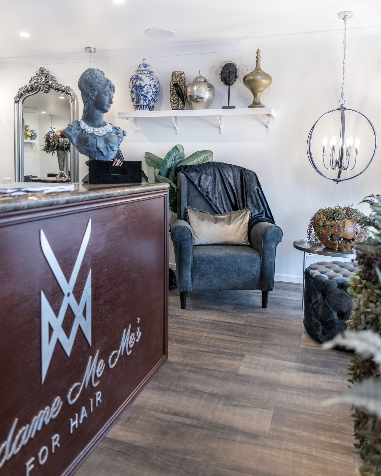 Ishoa says, “The client was very clear about the style and vision of the Madame Me Mes brand. We worked closely with them, to bring their concept to life. They had many functional and practical design requirements including 6 individual styling chairs and a bespoke reception desk for meeting guests. Oversized chandeliers, feature pendants, gold features, marble, artwork and statues were installed to pull the whole lux-monochrome hair salon concept together.”