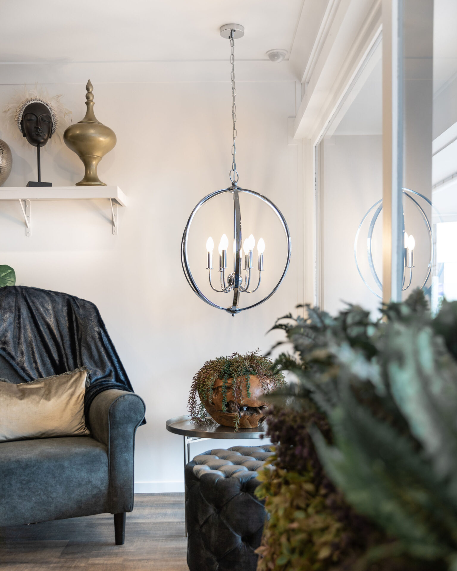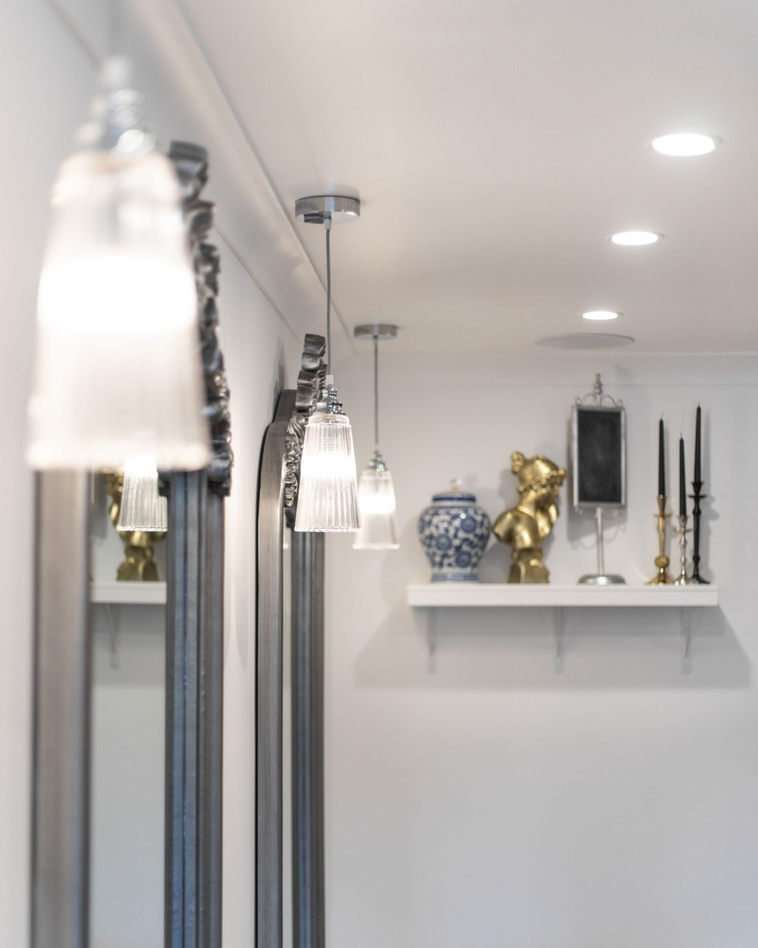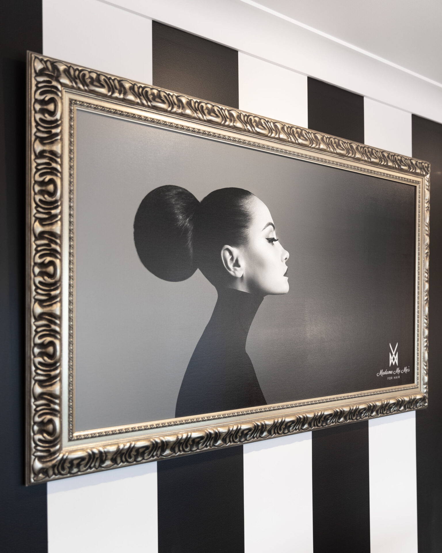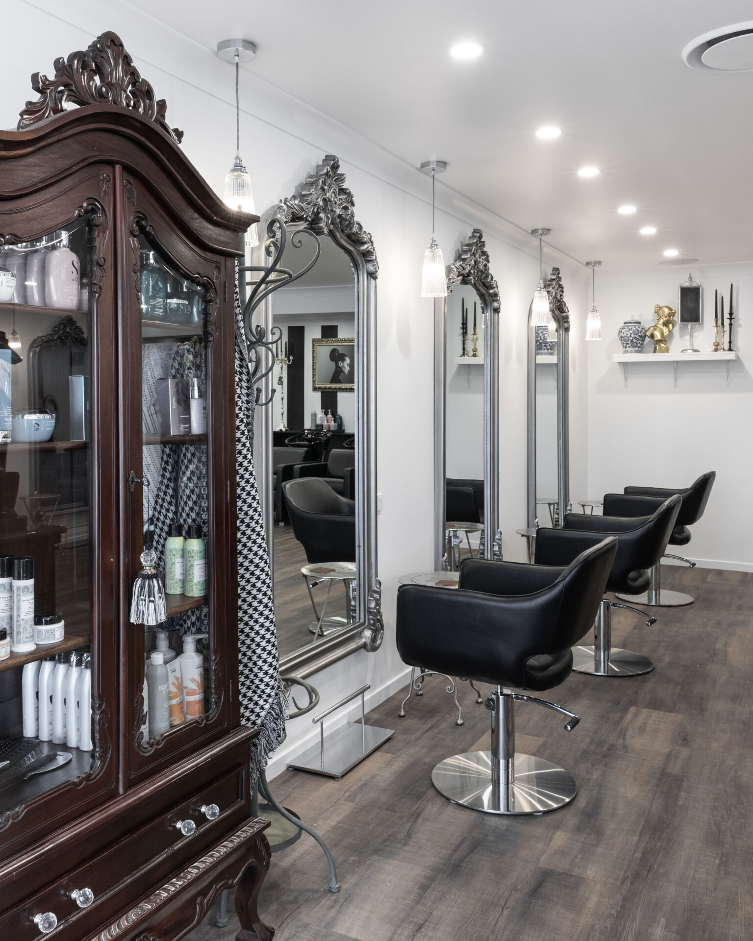Ishoa says, “The client was very clear about the style and vision of the Madame Me Mes brand. We worked closely with them, to bring their concept to life. They had many functional and practical design requirements including 6 individual styling chairs and a bespoke reception desk for meeting guests. Oversized chandeliers, feature pendants, gold features, marble, artwork and statues were installed to pull the whole lux-monochrome hair salon concept together.”