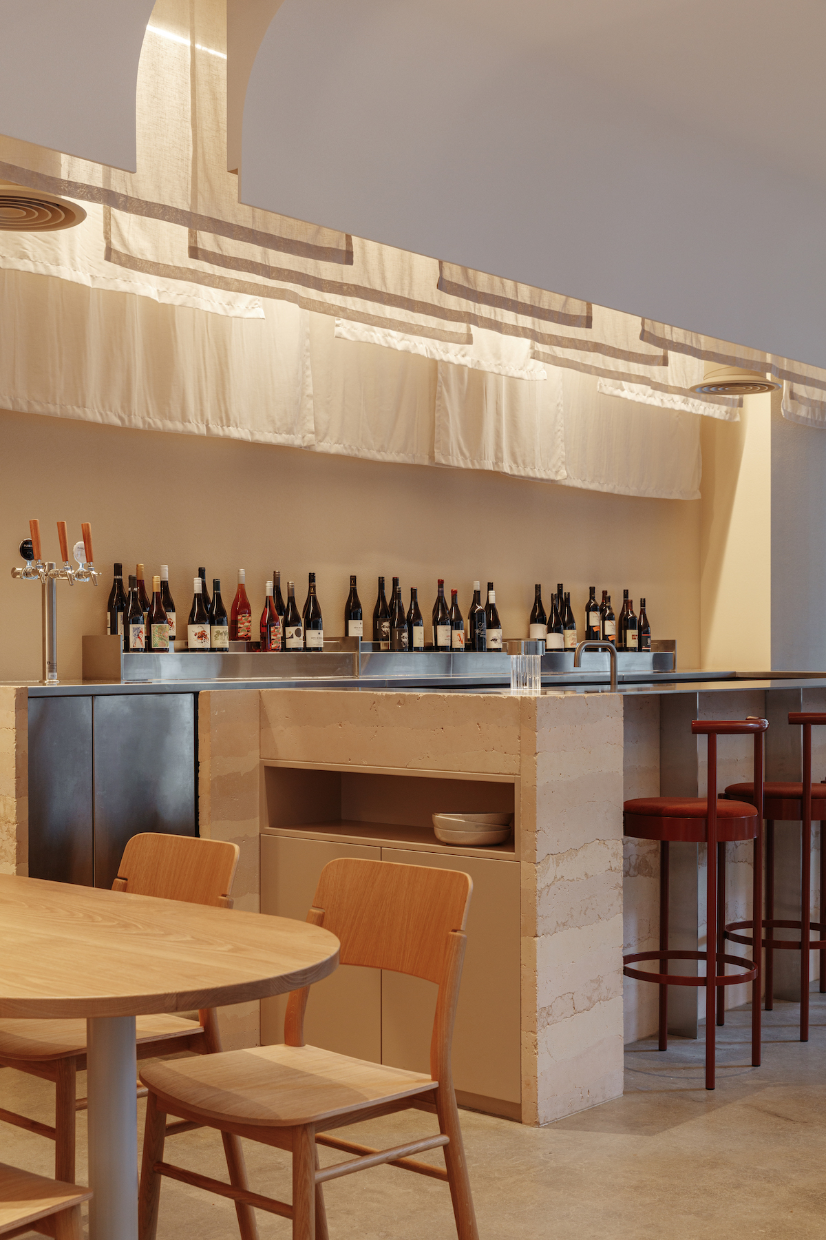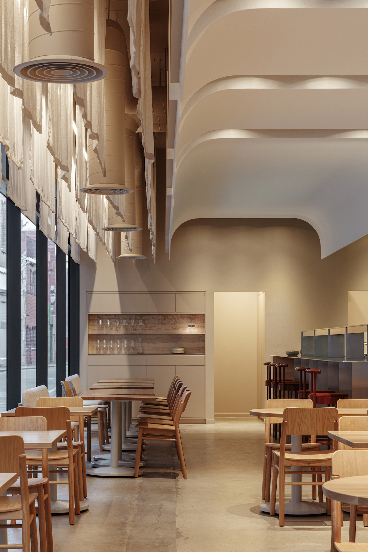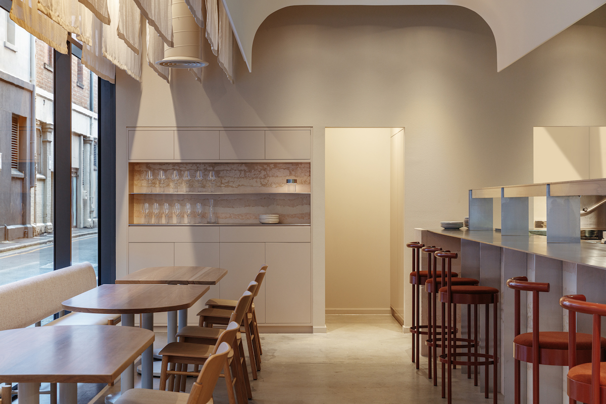 The narrow room and curved ceiling directs flow, taking you on a journey along the open kitchen – the centre of everything. Previously a Subway, Soi38 has been elegantly transformed into a warm, inviting eatery enhanced by a striking barrel vault ceiling, flanked by soft drapes inspired by Thai prayer flags. This fire- fuelled kitchen brings a touch of theatre and energetic ambiance to an already exquisite dining experience.