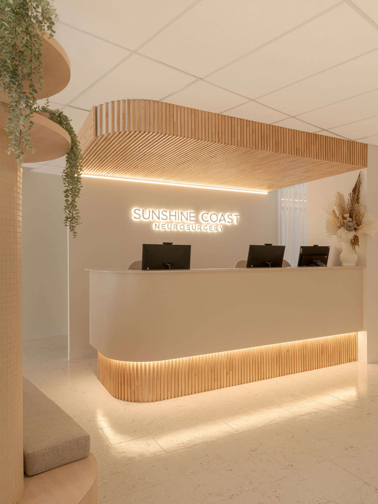 The commercial interior design of Sunshine Coast Neurosurgery showcases a harmonious blend of modern coastal aesthetics with functional medical space requirements.