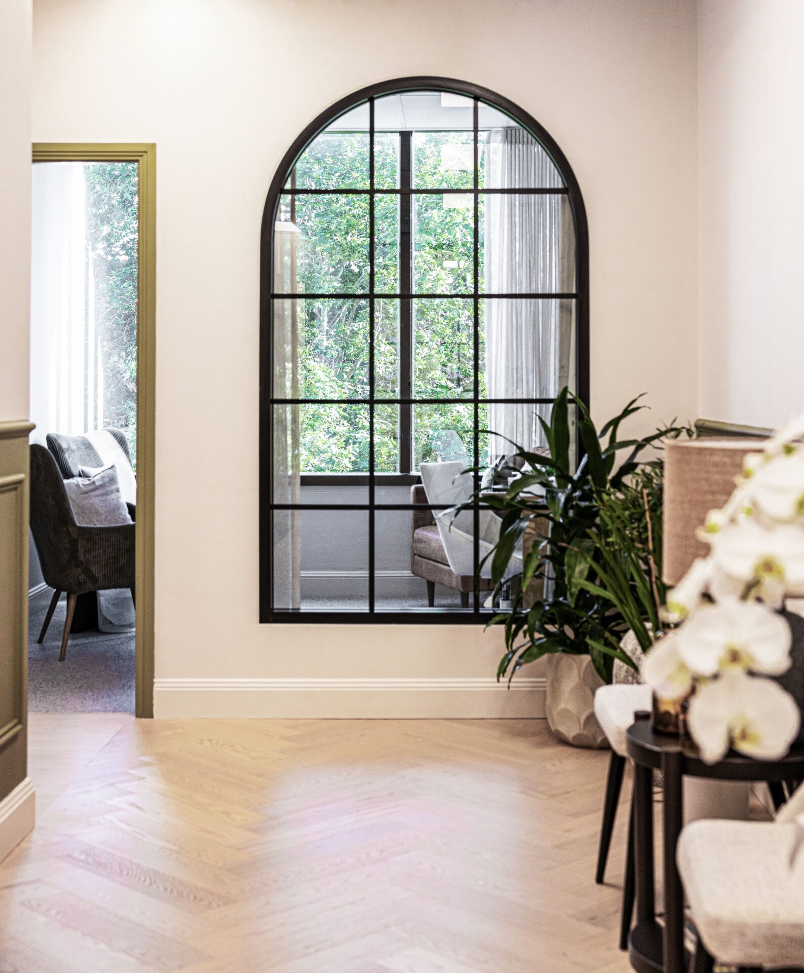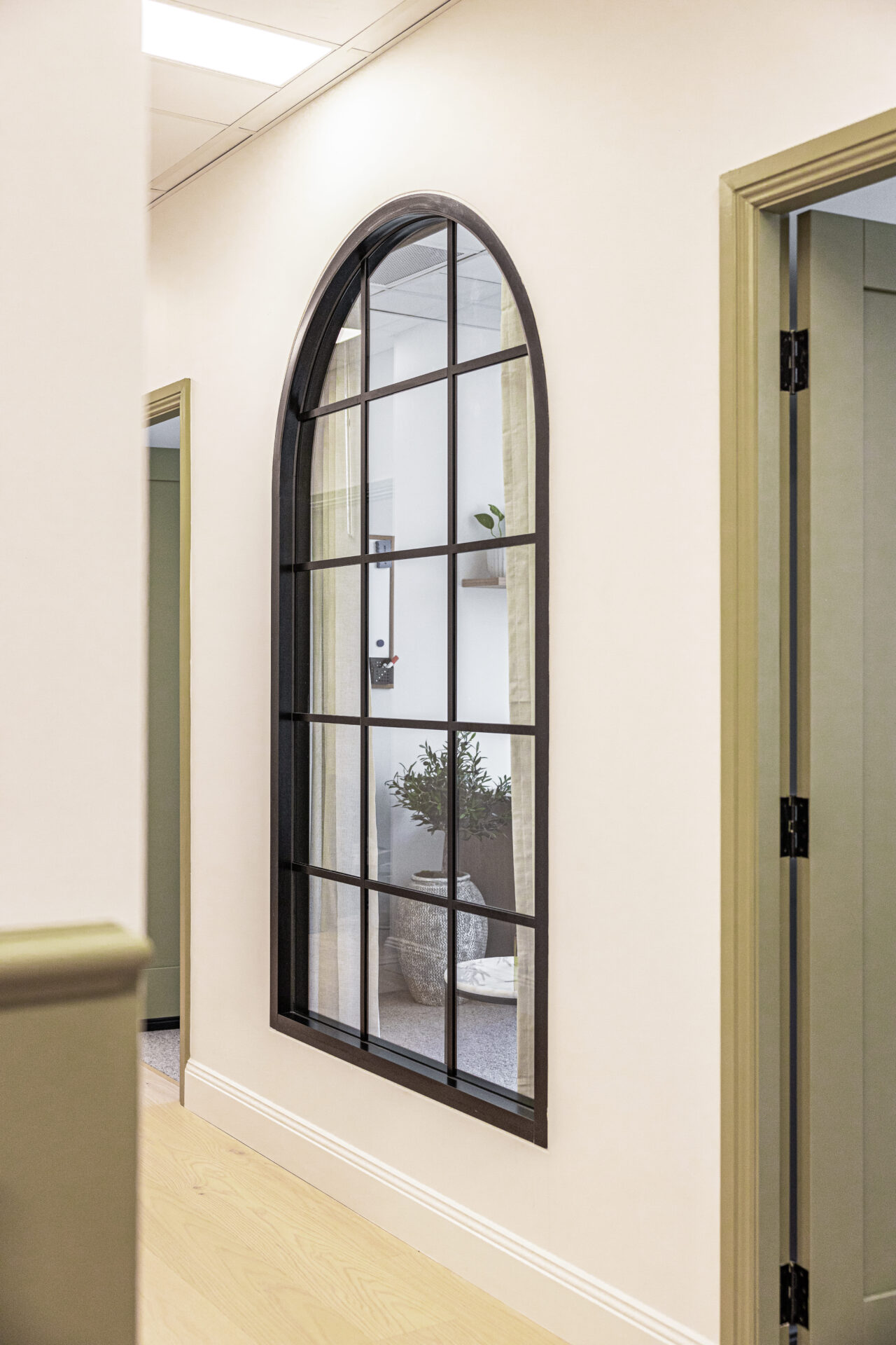 A standout feature in the reception area is the bespoke signage, framed with Venetian arched plastering. This arched commercial design element echoes the architectural curves of the windows, creating a sense of continuity and flow. The plastering adds a luxurious yet understated touch, elevating the space while keeping the focus on simplicity and elegance.