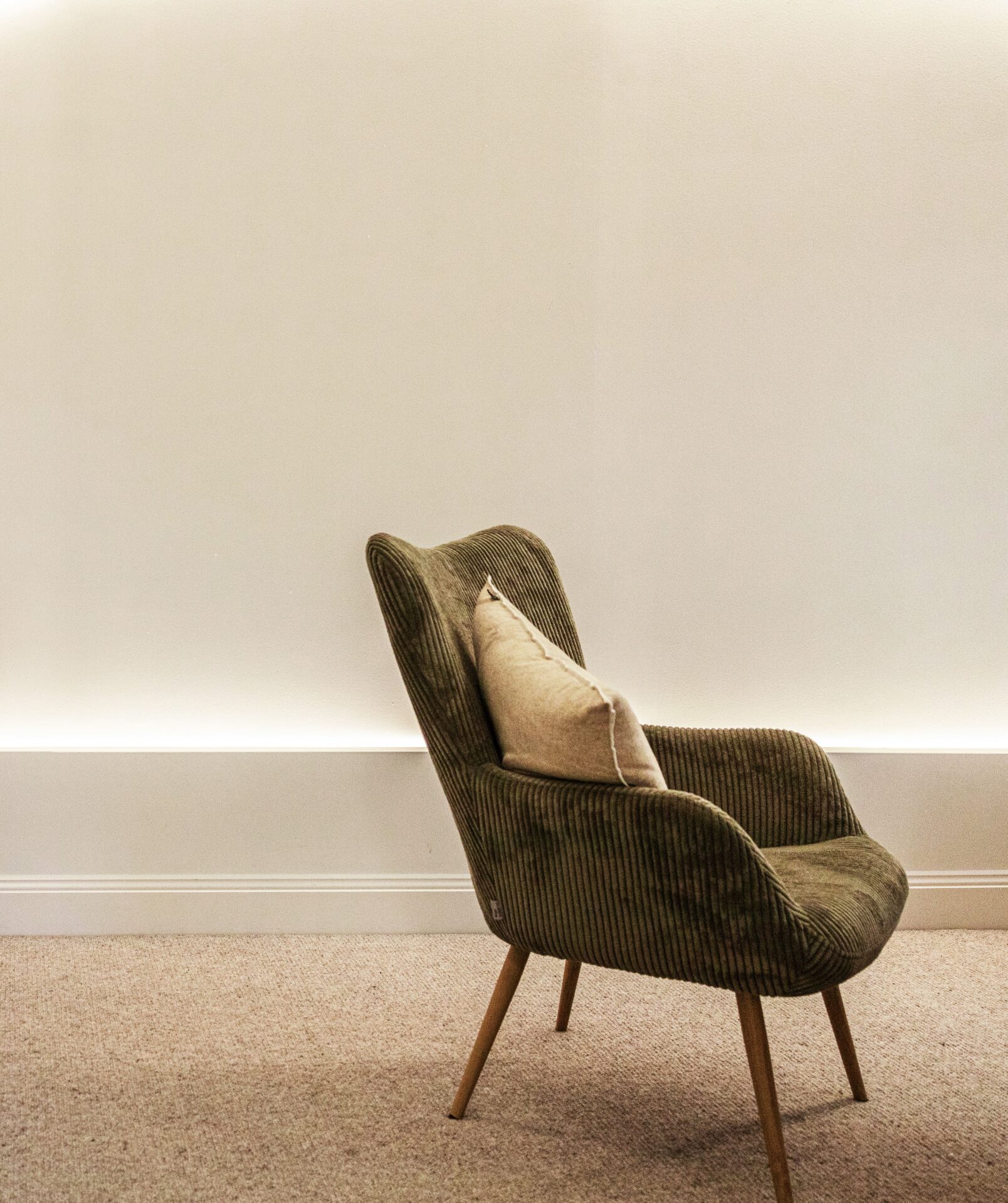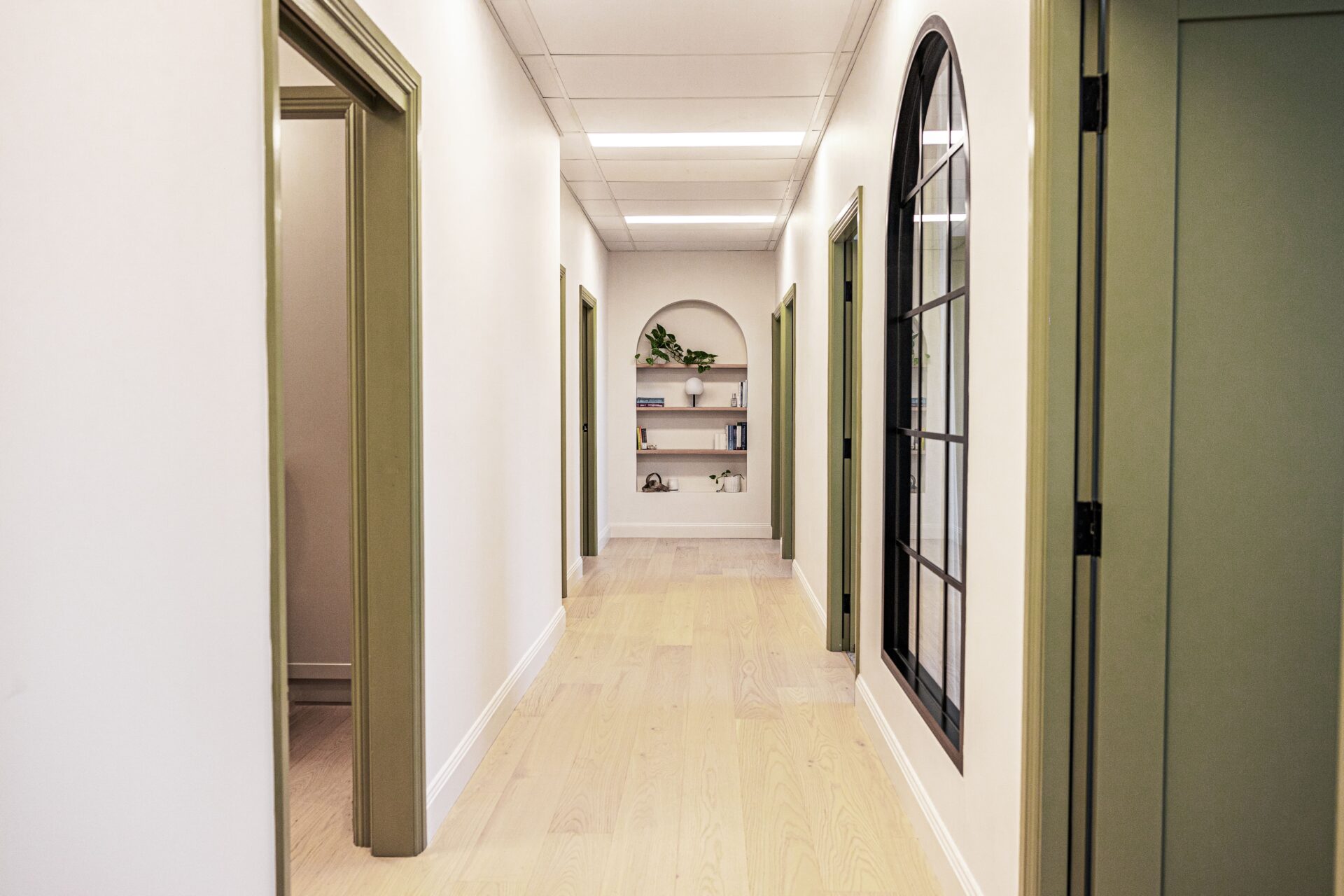 Within the individual therapy rooms, the commercial design prioritises comfort and tranquillity. Neutral carpet flooring has been chosen for these spaces, providing a sense of quiet and grounding that is essential for a therapeutic environment. The muted tones of the carpet complement the overall colour scheme, blending seamlessly with the sage green and neutral hues used throughout the practice. This careful coordination of colours and textures ensures that each room feels harmonious and conducive to introspection and healing.