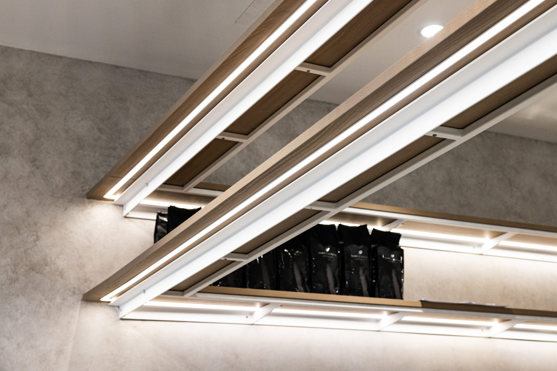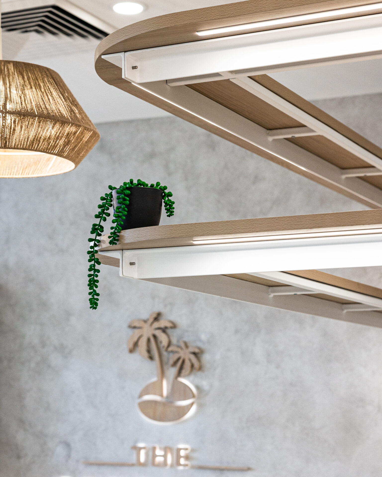The counter area of the commercial fit out stands out as a central feature of the cafe, designed with sleek wood and marble finishes that exude elegance and cleanliness. The presence of rattan features adds a touch of rustic charm, complementing the modern design elements. Above the service counter, white and timber framing provides structural accents, while LED strip lighting underneath introduces a cool element to the space. This blend of contemporary and natural materials creates a cohesive and inviting environment that is both functional and aesthetically pleasing.