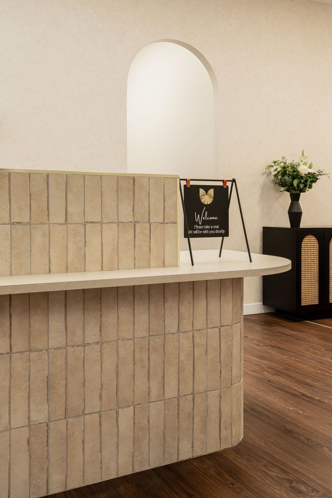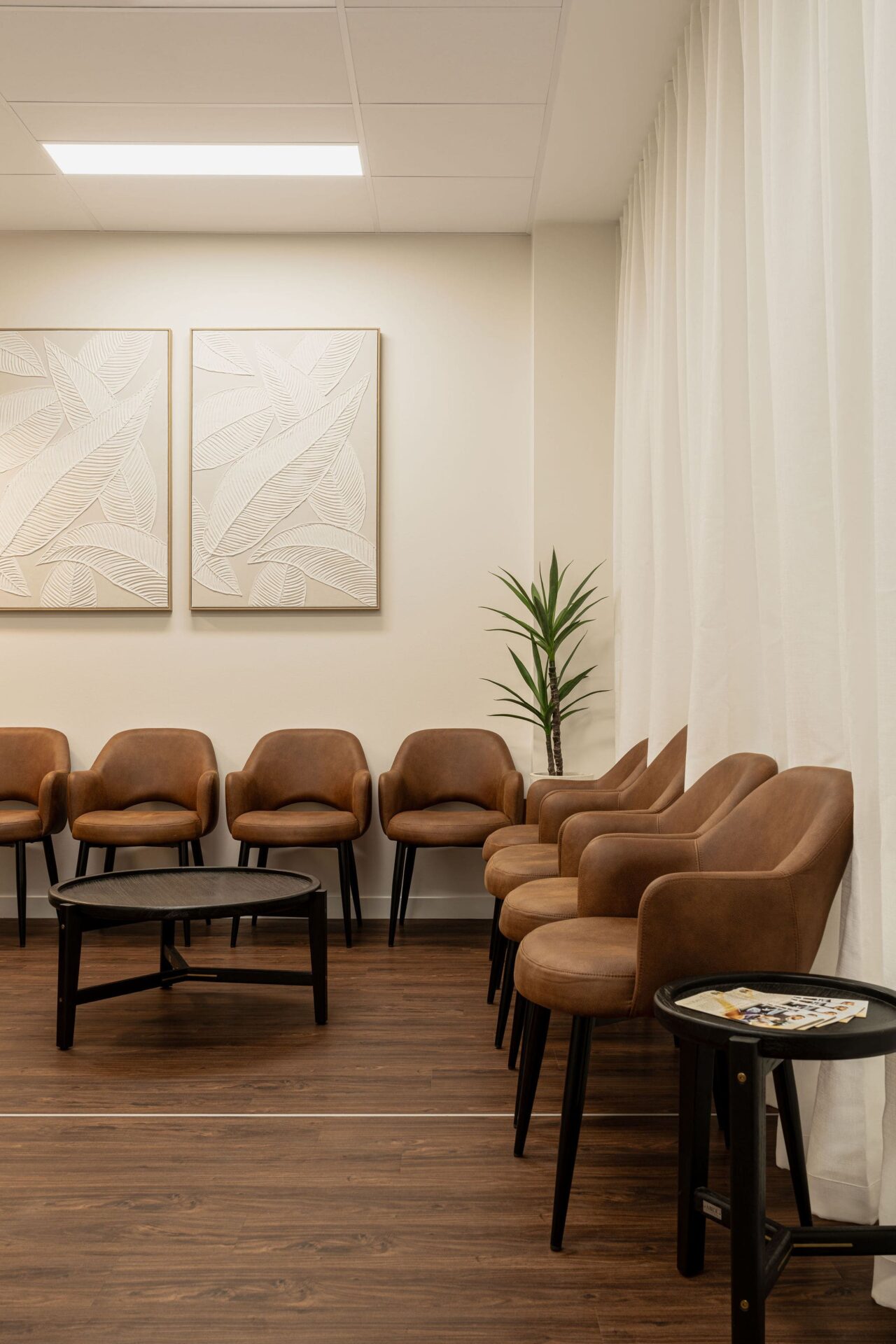Commercial design highlights include the incorporation of curved walls to open up the hallway, enhancing the flow and spatial dynamics of the clinic. The decision to opt for darker wood flooring proved to be a stroke of genius, adding depth and sophistication to the space.